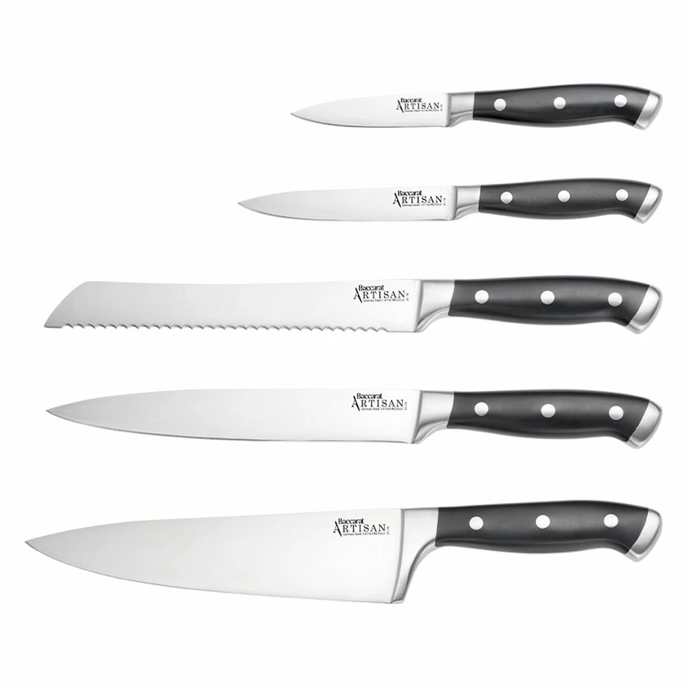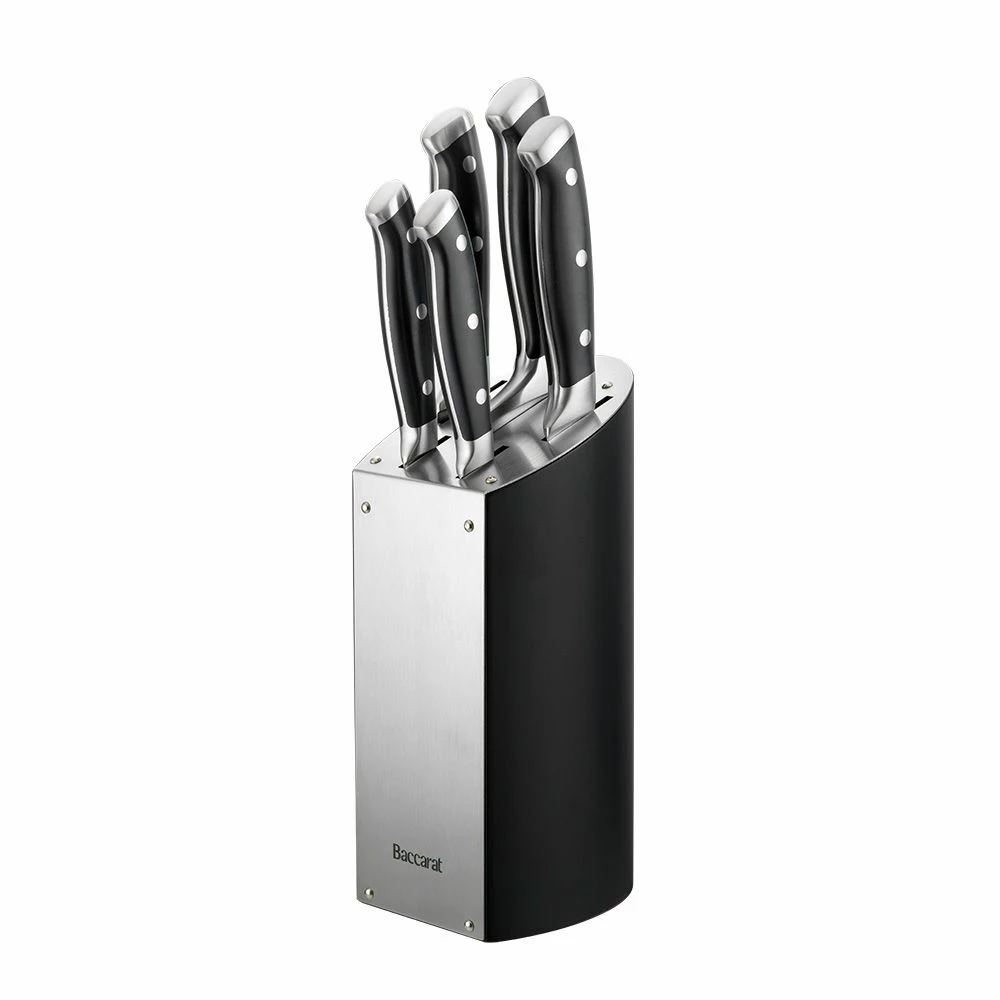 Combining sleek style and expert craftsmanship, the Kyoto Knife Block is the newest addition to Baccarat’s Artisan range that bring a modern touch to your kitchen. Inspired by traditional German bladesmiths, the Baccarat Artisan knives have been fully forged in both ice and fire to results in a more sturdy, durable, and sharp cutting blade that stays sharp for longer than standard knives. Ideal for prepping everything from meats and poultry to cheese, fruit and vegetables, the Baccarat Artisan knives perfectly rounded to accommodate any kitchen task. Fitted with triple rivet handles that have been moulded into a smooth bolster shape with added finger guard, the Baccarat Artisan knives have an enhanced balance and safety design to provide you with more control and comfort while cutting. Housed in the stylish Kyoto stainless steel block to keep the blades in their optimal condition, the Baccarat Artisan knives will make an impressive statement in your kitchen.