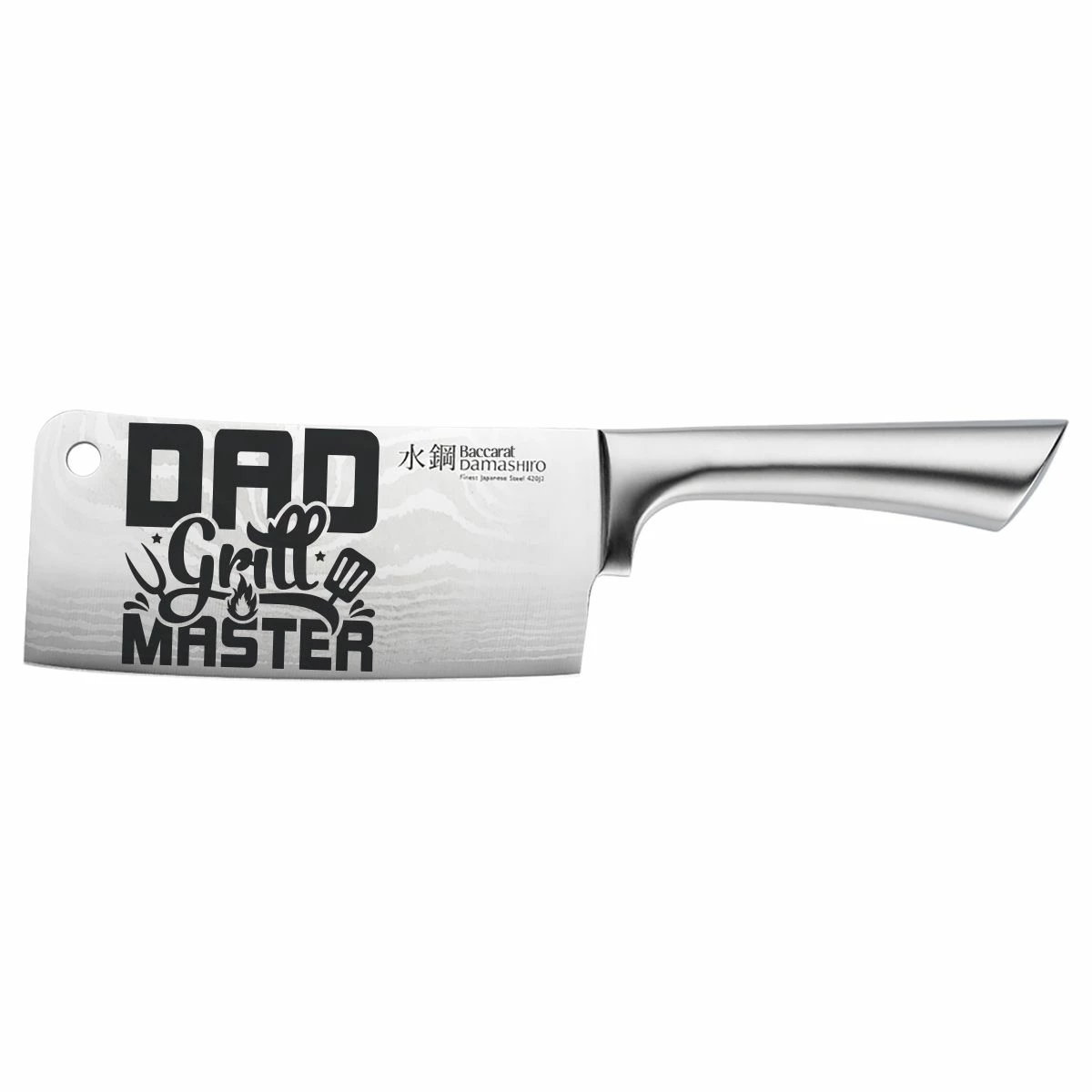 Surprise dad by showing him how much you appreciate him and his cooking with the Baccarat Damashiro Cleaver Knife 17cm. Featuring a custom design, this knife arrives with the text ‘The Grill Master’ embellished across the blade as well as attractively boxed and ready for gifting. Cut through large pieces of meat with precision and control with the Baccarat Damashiro Cleaver Knife 17cm! This high-performance kitchen staple is forged with stainless-steel blades for ultimate sharpness and smooth, easy chopping. Perfectly weighted and balanced, the Baccarat Damashiro Cleaver offers a professional touch to your culinary experience at home. With the Baccarat Damashiro Cleaver, you can create delicious meals with precise handling and enhanced control. Featuring a traditional Damascus inspired blade, the Baccarat Damashiro Cleaver is a stylishly functional addition to any kitchen. Give dad a gift he will treasure for meals to come with the custom designed Baccarat Damashiro Cleaver Knife 17cm.