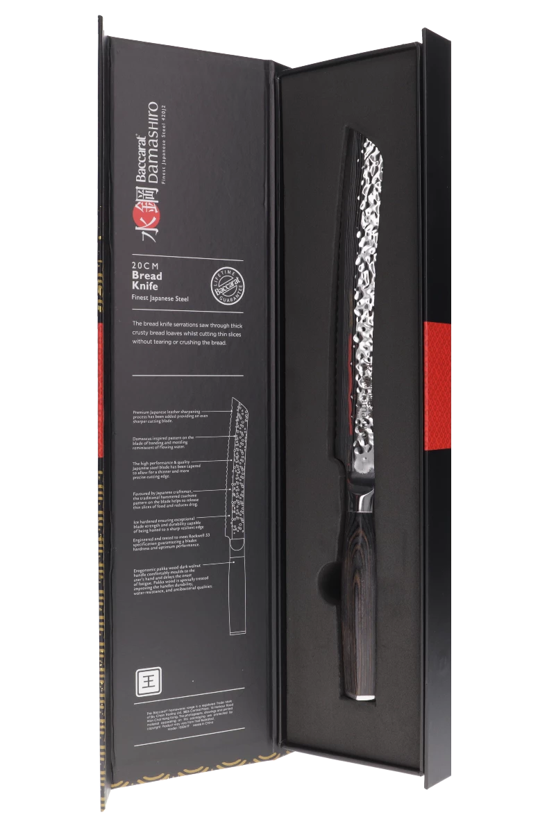 - The Baccarat® Damashiro® EMPEROR Bread Knife allows you to cut thick crusted breads without crushing or tearing their soft centers. The knives measured serrations help cutting through foods with tough exteriors.
