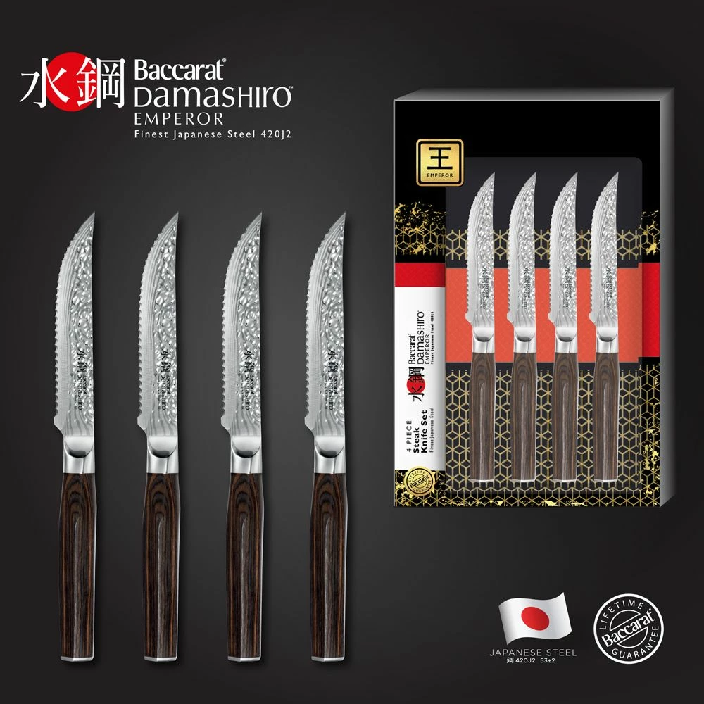 - The Baccarat® Damashiro® EMPEROR 4-piece knife set includes sleek steak knives with perfectly balanced 11.5cm serrated blades crafted from quality Japanese steel