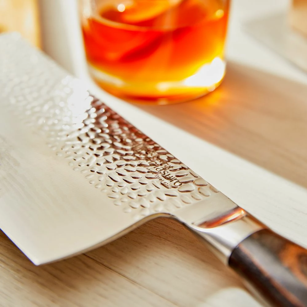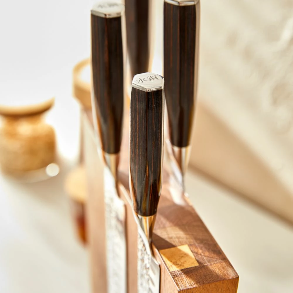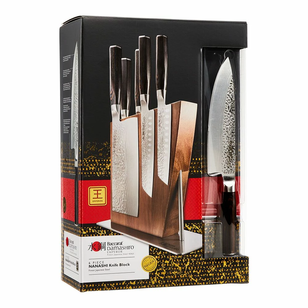 Be inspired in the kitchen and slice and dice like a professional chef using the Baccarat Damashiro Emperor Nanashi Knife Block! Crafted from specialist ice hardened Japanese steel, these knives are super tough, resistant to shattering and capable of being honed to a sharp resilient edge. Each knife is designed with gorgeous, ergonomic pakka wood handles that are dark walnut in colour and comfortably mould to the users hand to delay the onset of fatigue. Pakka wood is specially treated improving the handles durability, water-resistance and antibacterial qualities. Favoured by Japanese craftsman, the traditional hammered tsuchime pattern on the blade helps to release thin slices of food and reduce drag. The high performance and quality Japanese steel blades have been tapered to allow for a thinner and more precise cutting edge. Housed on an elegant double-sided magnetic knife block, this premium collection of essential kitchen knives looks great on any kitchen counter. Enjoy a lifetime of quality culinary experiences backed by the Baccarat Lifetime Guarantee!