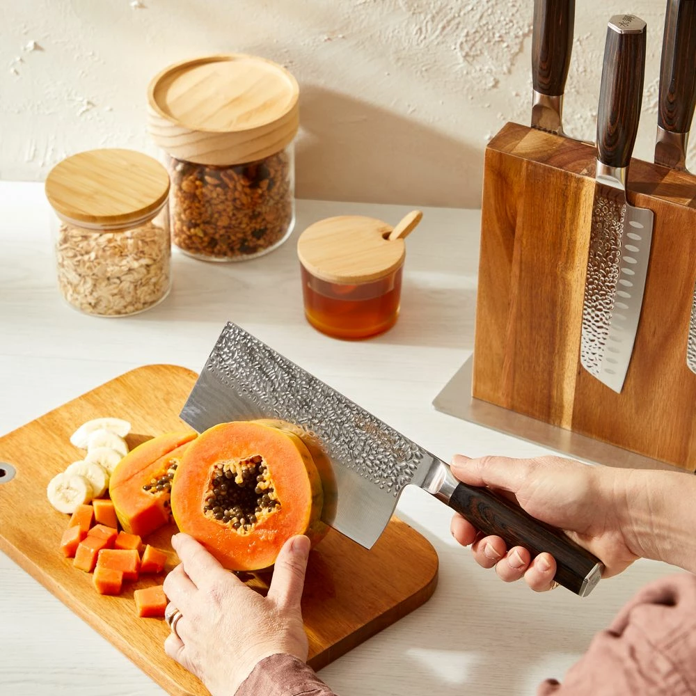 1 x Chefs Knife, 1 x Carving Knife, 1 x Cleaver, 2 x Santoku Knives, 1 x Knife Block