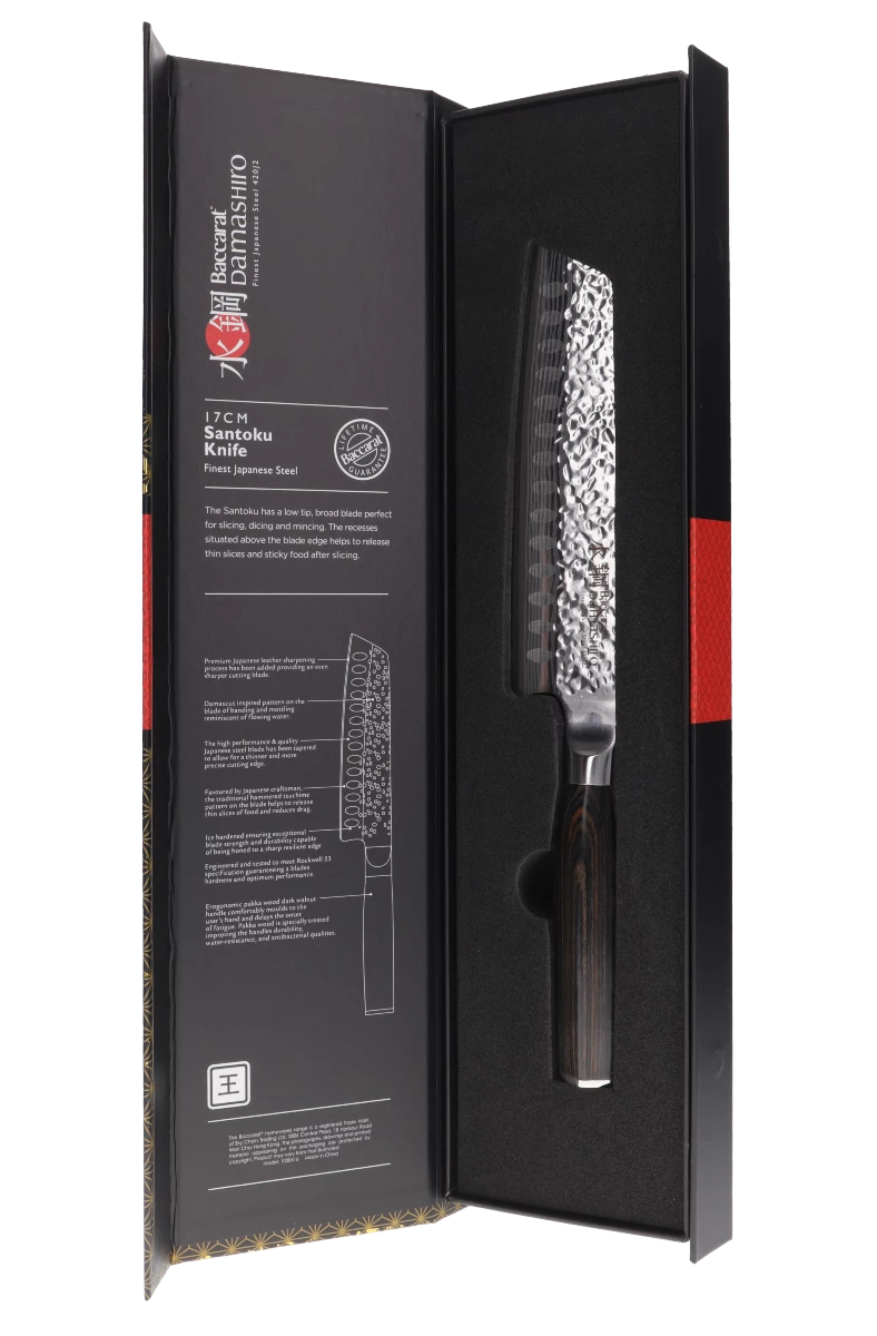 - The Baccarat® Damashiro® EMPEROR Santoku is #1 in the kitchen for Cutting, Slicing, Chopping, Dicing, Mincing and so much more. It is the Perfect knife when cutting meats, slicing cheeses, and chooping or dicing vegatibles and nuts. The recessed scallops
