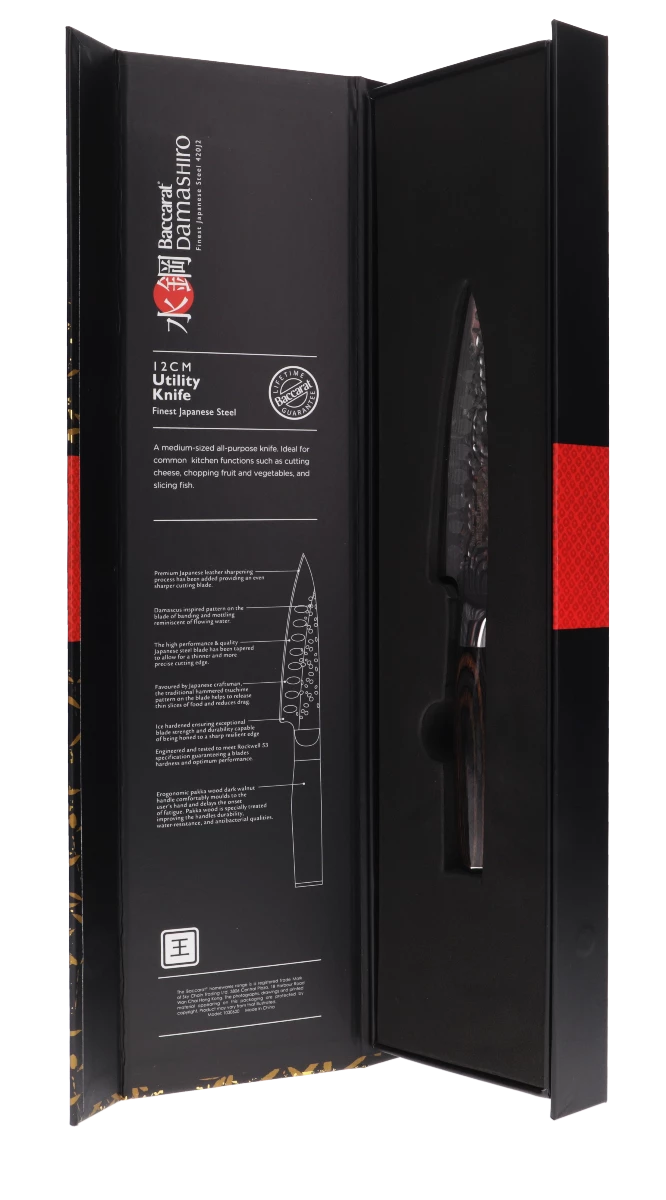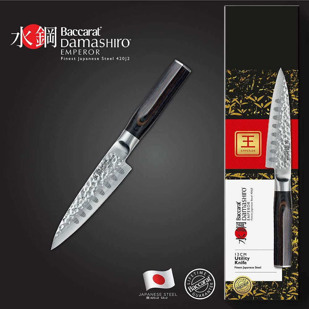 Experience professional quality in your kitchen with the Baccarat Damashiro Emperor Utility Knife. Versatile and multi-purpose, the Damashiro Emperor Utility Knife is an essential kitchen accessory. Crafted for maximum control and ease of use this premium knife from the Damashiro range is extremely durable and comes with a life-time guarantee. The Damashiro Emperor Utility Knife can be used for a great selection of cutting needs and is an ideal addition to your kitchen utensils for the ultimate cooking experience.