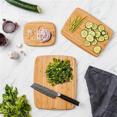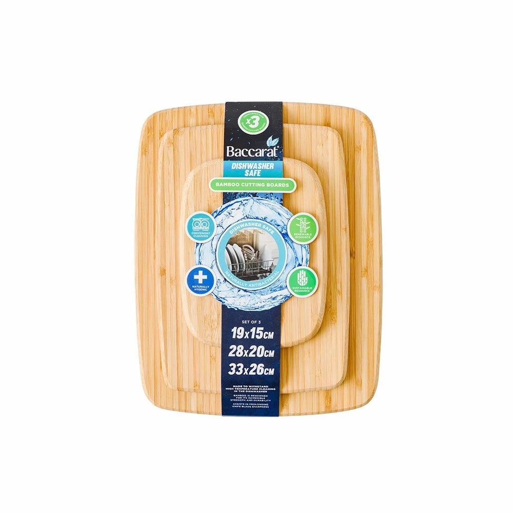 The Baccarat Dishwasher Safe Bamboo Cutting Board 3 Piece Set has been designed to assist keeping the kitchen safe and hygienic while prepping food. Crafted from premium quality bamboo fibres, the Baccarat Bamboo Cutting Board is an eco-friendly alternative to hardwoods and plastics. Bamboo is a fast-growing plant that uses minimal water and no chemicals, making it the perfect renewable and ethical resource. Naturally antibacterial, the Baccarat Dishwasher Safe Bamboo Cutting Board will also remain resistant to food bacteria, making your meal prep safe and healthy. Featuring three beautiful bamboo cutting boards with a gorgeous natural finish makes them perfect for any kitchen. The Baccarat Dishwasher Safe Bamboo Cutting Board is capable of withstanding high temperature cleaning in the dishwasher.