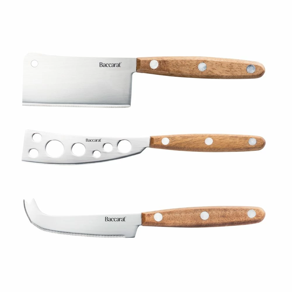 The Baccarat Gourmet Cheese Knife Set 3 Piece is perfect for those who appreciate fine cheese. Each piece in the set is made using quality stainless steel and real natural wood helping to deliver a full gourmet experience. The handles are triple riveted to ensure a robust construction and the wooden handles provide an ergonomic grip. The set is presented in a gift box making it a great gift idea for any occasion.