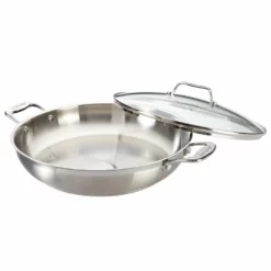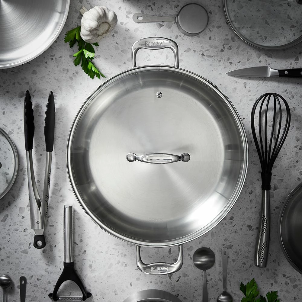 Enhance your kitchen with superior quality Cookware using the Baccarat iconiX Chef”s Pan with Lid 32cm. Made from the highest grade 18/10 stainless steel and with a durable 5mm aluminum impact bonded base that works to distribute heat evenly, the Baccarat iconiX 32cm Chefs Pan with Lid is a must-have Cookware piece for any kitchen. With an easy clean mirror finish interior and stay cool cast stainless steel riveted handles, the Baccarat iconiX 32cm Chef’s Pan will make cooking like a professional part of your everyday life. The Baccarat iconiX range is suitable for all cook tops including induction and is dishwasher safe for your convenience.