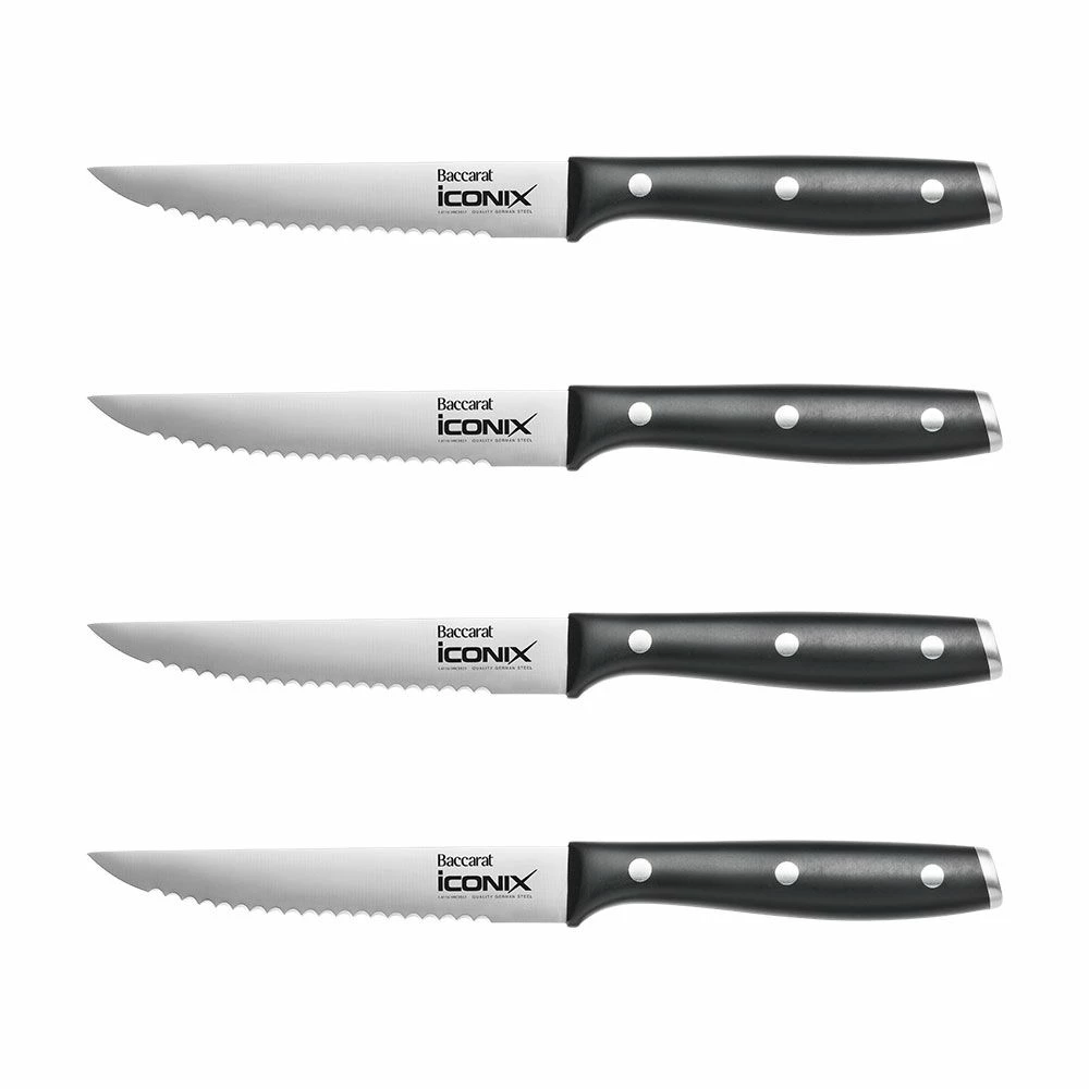 Cut through succulent steaks with the stylish and high performance Baccarat iconiX 4 Piece Steak Knife Set! Ideal for enjoying delicious roast dinners, steak and other meat dishes, these knives feature razor sharp serrated edges for cutting through meat without crushing or tearing. Inspired by traditional German craftsman and bladesmiths, Baccarat iconiX blades are made from premium German Stainless Steel. Expertly designed with durable polymer handles, the iconiX Steak Knives by Baccarat offer a contoured grip for comfort and control. Fantastic for both casual everyday dining and formal occasions, this steak knife set brings a touch of sophistication to any dining experience. Enhance your steak indulgence with the Baccarat iconiX 4 Piece Steak Knife Set!