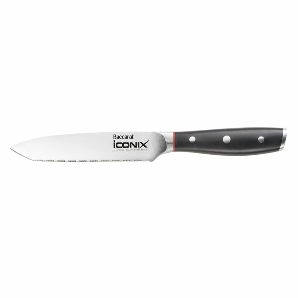Inspired by traditional German craftsman and bladesmiths, the Baccarat iconiX blades are made from premium German Stainless Steel. The Baccarat iconiX All Purpose Try Me Knife is an essential for taking care of all your everyday kitchen cutting tasks. Combining all the superb technical characteristics favoured by chefs all around the world, this knife is a premium addition to your kitchen knife collection. The blade is produced with a controlled tempered process to ensure the best possible hardness, toughness and flexibility. Designed with durable polymer handles that have been contoured for a comfortable grip, this knife assists to hold the hand safely away from the blade to ensure effortless cutting and slicing. Forged to produce perfect control, weight and balance, the iconiX All Purpose Try Me Knife by Baccarat will improve your everyday meal preparation. Coordinate with additional pieces from the iconiX range by Baccarat for the ultimate kitchen knife collection.