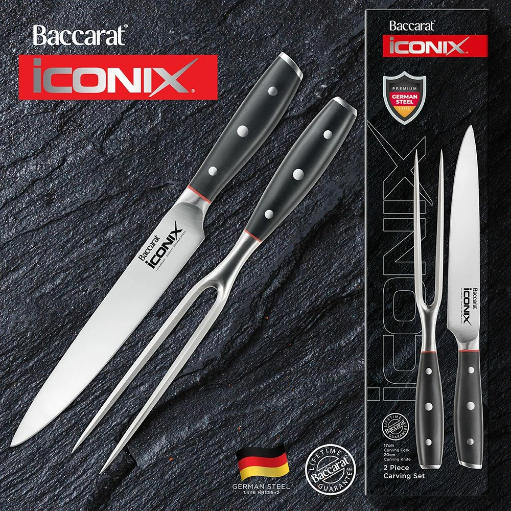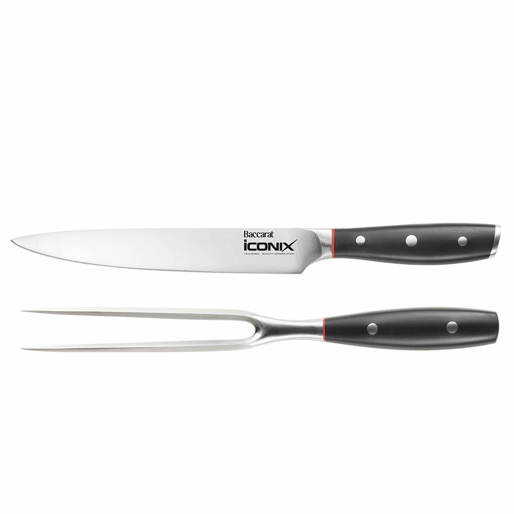 - The Baccarat® iconiX® Carving set is perfect for carving and serving meats with ease. The knife’s curved blade profile help to follow contours and guide meat away from the bone. The carving fork is perfect for holding meat in place while slicing and helps