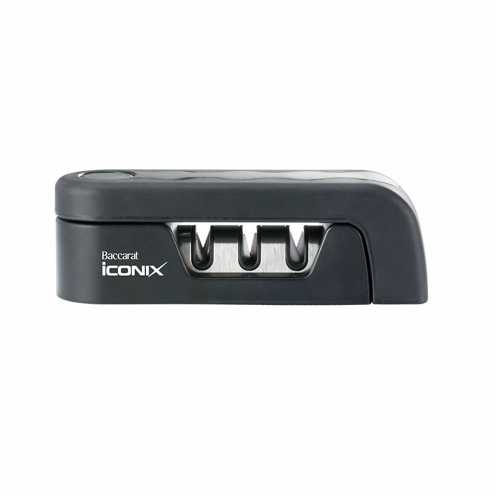 Maintain razor sharp kitchen knives with the premium Baccarat iconiX 3 Step Folding Knife Sharpener. This unique knife sharpener is an essential for every kitchen and has been carefully crafted to maintain sharp blades for your everyday cooking needs. Step one is the preparation phase whereby a diamond abrasive edge is used to shape the burr-free edge. Step two then goes into the sharpening stage where a tungsten steel blade sharpens the dull edge on your knife. Step three is the polishing phase, where a ceramic edge finishes the job by polishing the edge of your blade. Equipped with a 3 step sharpening and care instruction guide on the packaging, this sharpener is super easy to use. Designed to fold down when not in use, the iconiX 3 Step Folding Knife by Baccarat folds in half for compact storage.