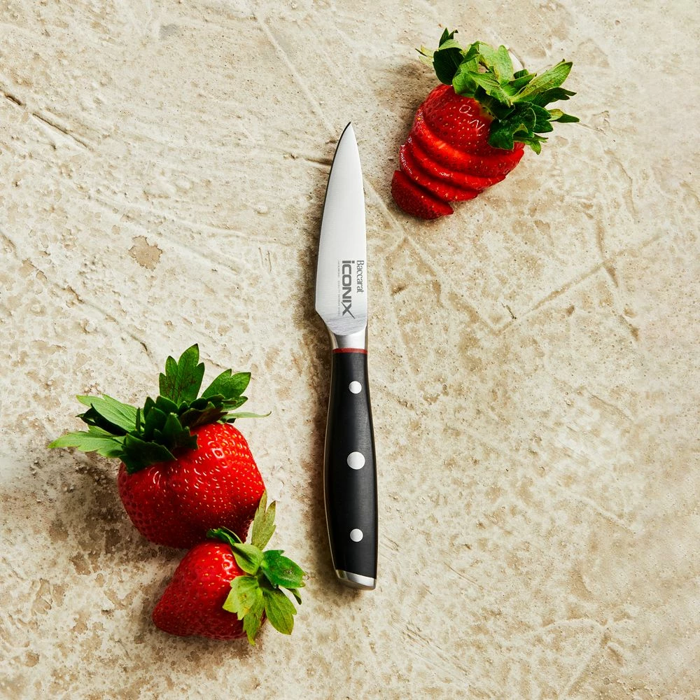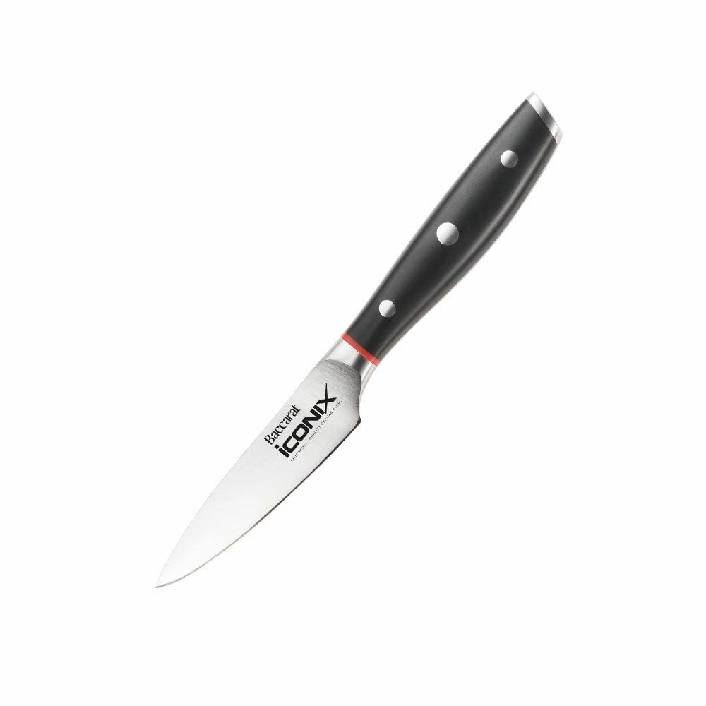 Take care of your everyday intricate cutting tasks in the kitchen with the iconiX Paring Knife by Baccarat! Inspired by the traditional German craftsman and bladesmiths, Baccarat blades are made from premium German stainless steel. Combining all the superb technical characteristics favoured by chefs all around the world, the iconiX Paring Knife by Baccarat is a premium addition to your kitchen knife collection. It is versatile and handy for peeling mushrooms, de-veining prawns, turning potatoes and other intricate tasks and is forged to produce perfect control, weight and balance. Produced with a controlled tempered process, the Baccarat iconiX blades ensure the best possible hardness, toughness and flexibility. Designed with durable polymer handles that are contoured for a comfortable grip, this knife assists to hold the hand safely away from the blade to ensure effortless cutting and slicing. Experience a lifetime of quality kitchen cutting experiences backed by the Baccarat Lifetime Guarantee!