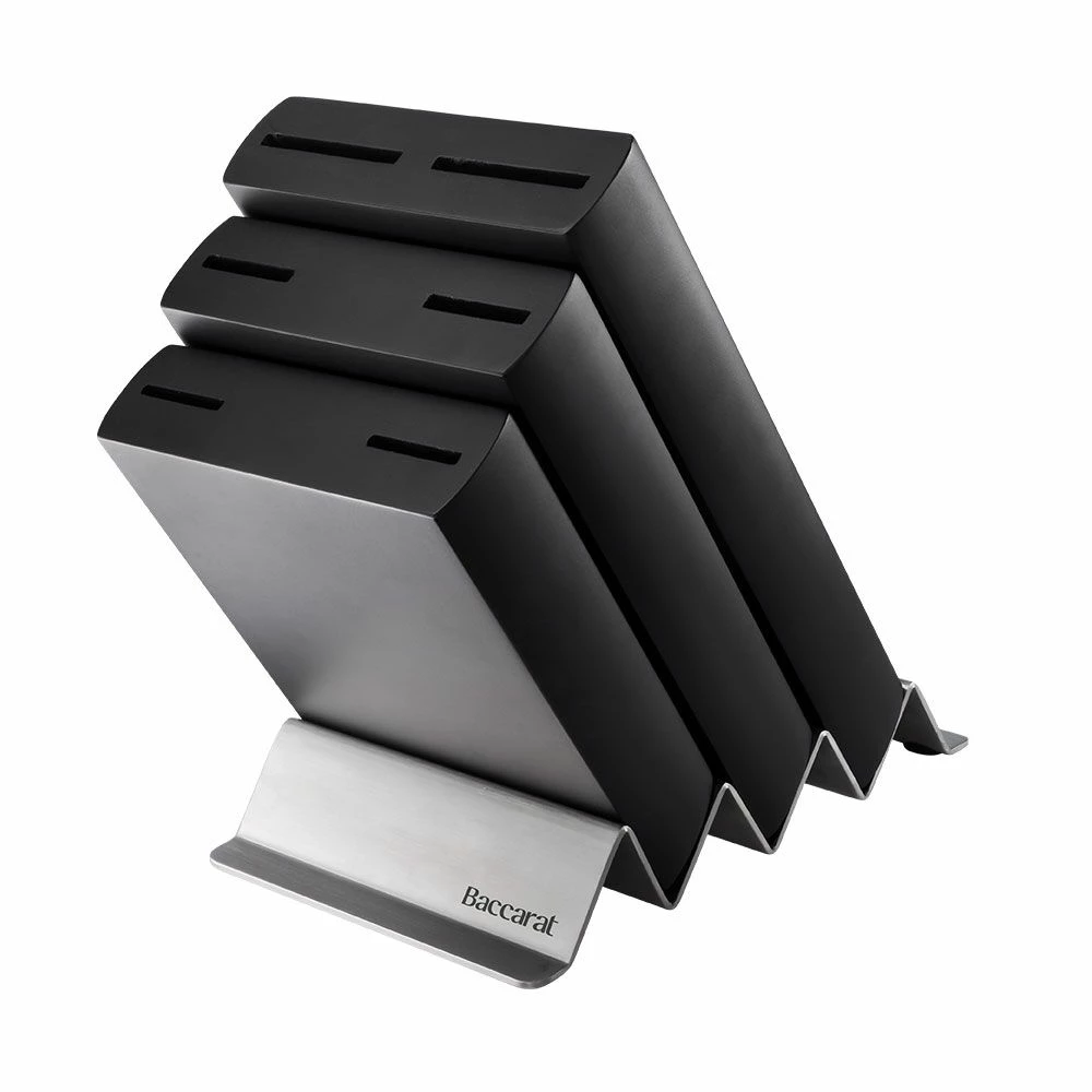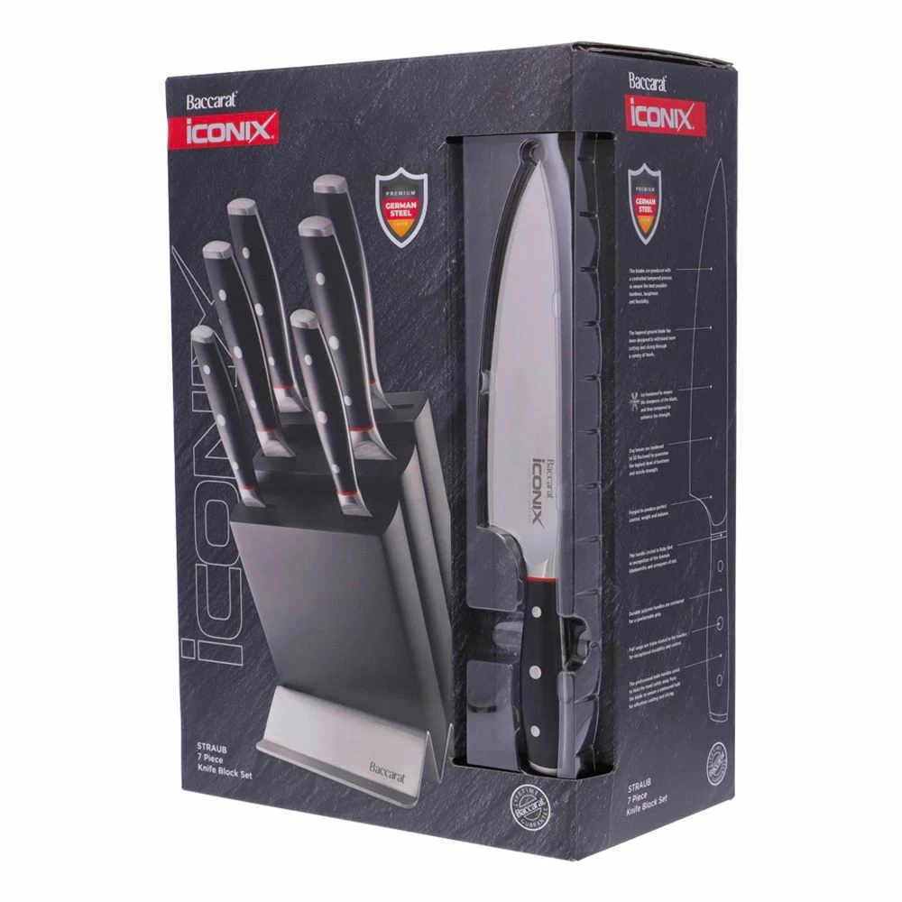 Bringing bladesmith perfection to your kitchen, the iconiX Straub Knife Block by Baccarat is a luxurious addition to your culinary collection. Inspired by the traditional German craftsman and bladesmiths. Baccarat iconiX blades are made from premium German Stainless Steel. The blades are produced with a controlled tempered process to ensure the best possible hardness, toughness and flexibility. Housed in a stylish black coated rubber wood knife block with a stainless steel base, these knives bring a touch of sophistication to any culinary space. Designed with professional handles, these knives assist to hold the hand safely away from the blade to ensure a contoured hold for effortless cutting and slicing. Enjoy a lifetime of quality culinary experiences with the premium iconiX Straub Knife Block by Baccarat, backed by the Baccarat Lifetime Guarantee!
