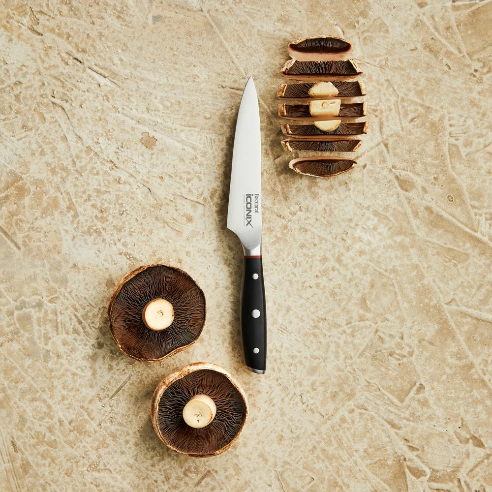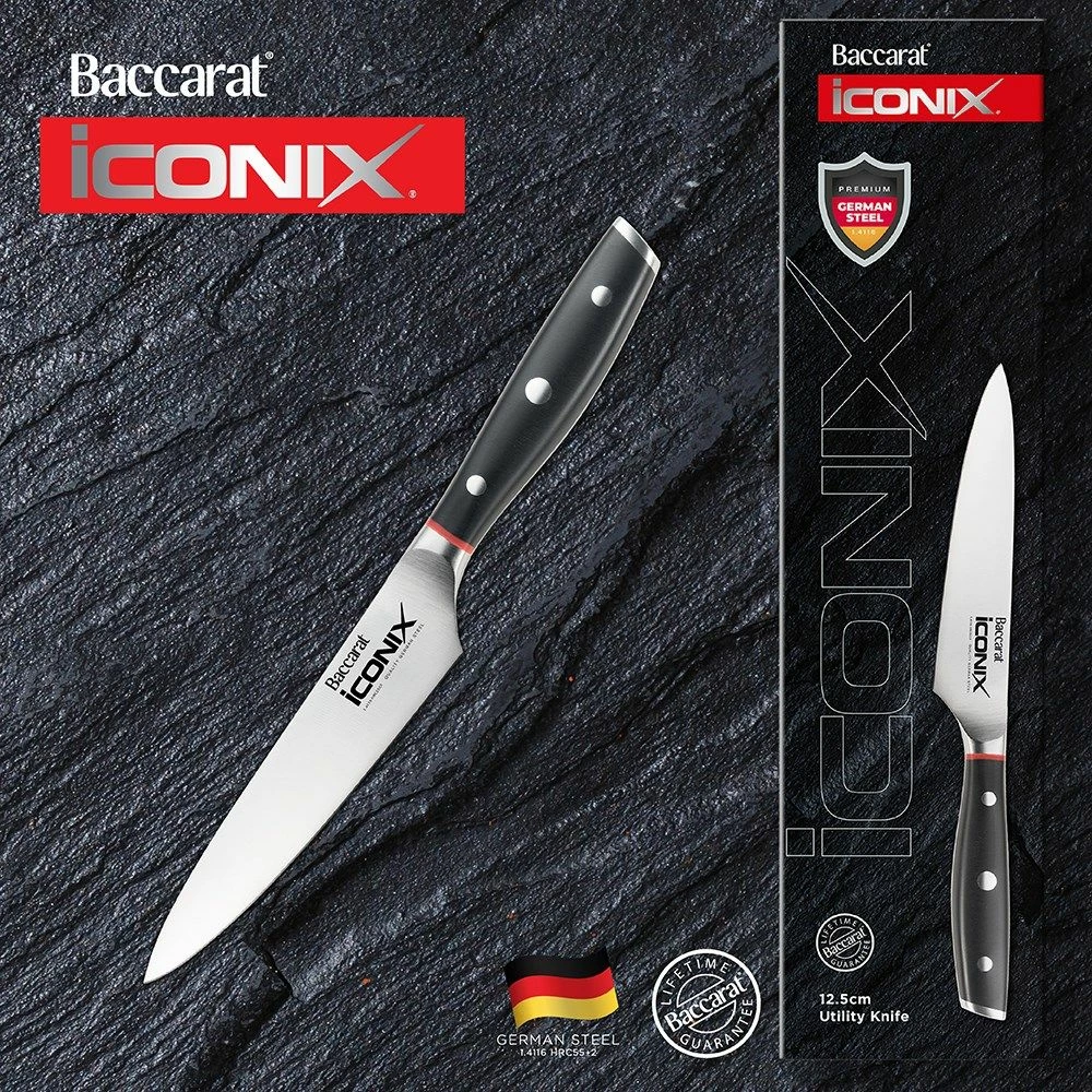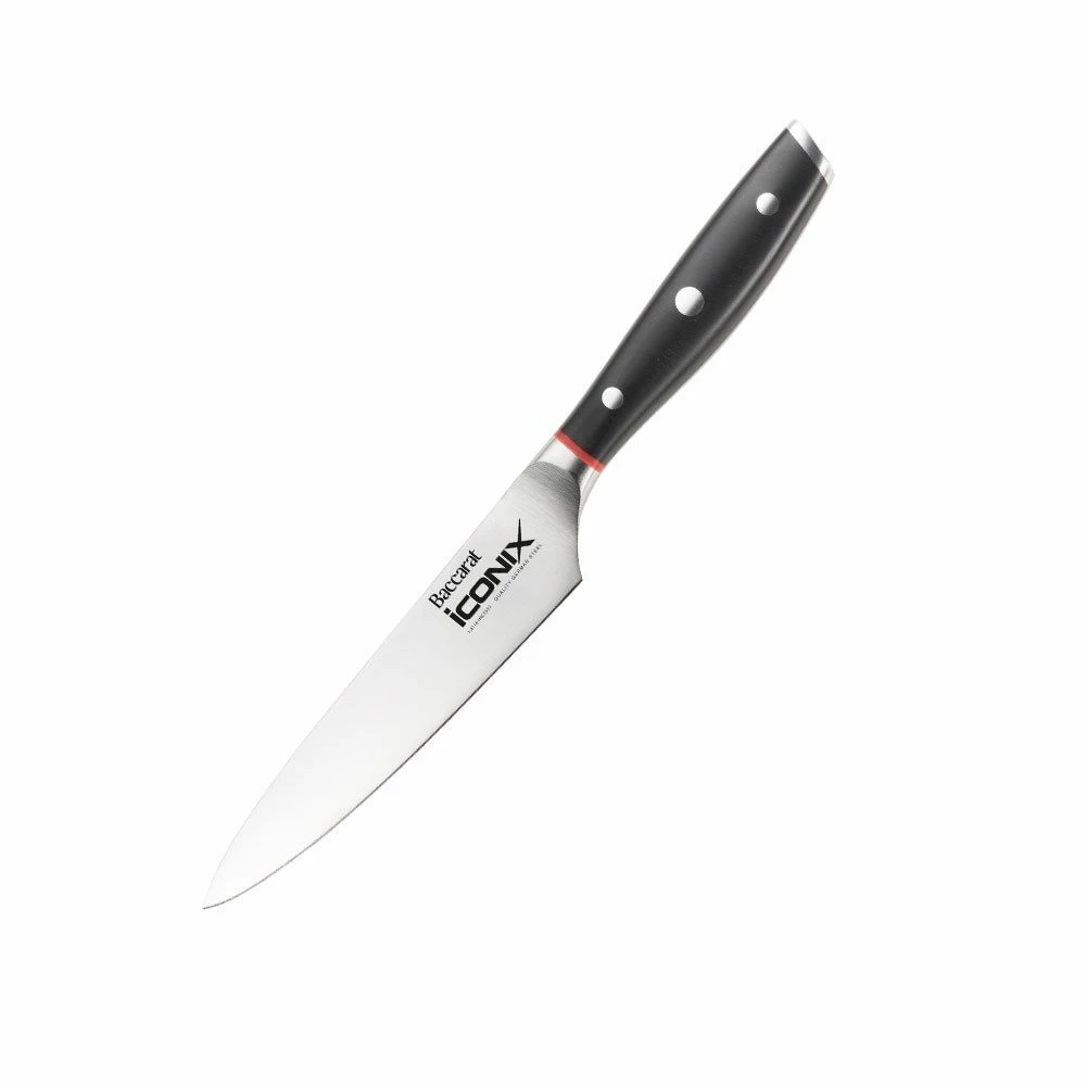 Prepare delicious ingredients for cooking with the versatile and premium quality Baccarat iconiX Utility Knife! Inspired by traditional German craftsman and bladesmiths, the Baccarat iconiX blades are made from premium German Stainless Steel. Combining all the superb technical characteristics favoured by chefs all around the world, this knife is a premium quality addition to your kitchen knife collection. The blade is produced with a controlled tempered process to ensure the best possible hardness, toughness and flexibility. Designed with durable polymer handles that have been contoured for a comfortable grip, this knife assists to hold the hand safely away from the blade to ensure effortless cutting and slicing. Forged to produce perfect control, weight and balance, the Baccarat iconiX Utility Knife will improve your everyday meal preparation. Coordinate with additional pieces from the iconiX range by Baccarat for the ultimate kitchen knife collection.