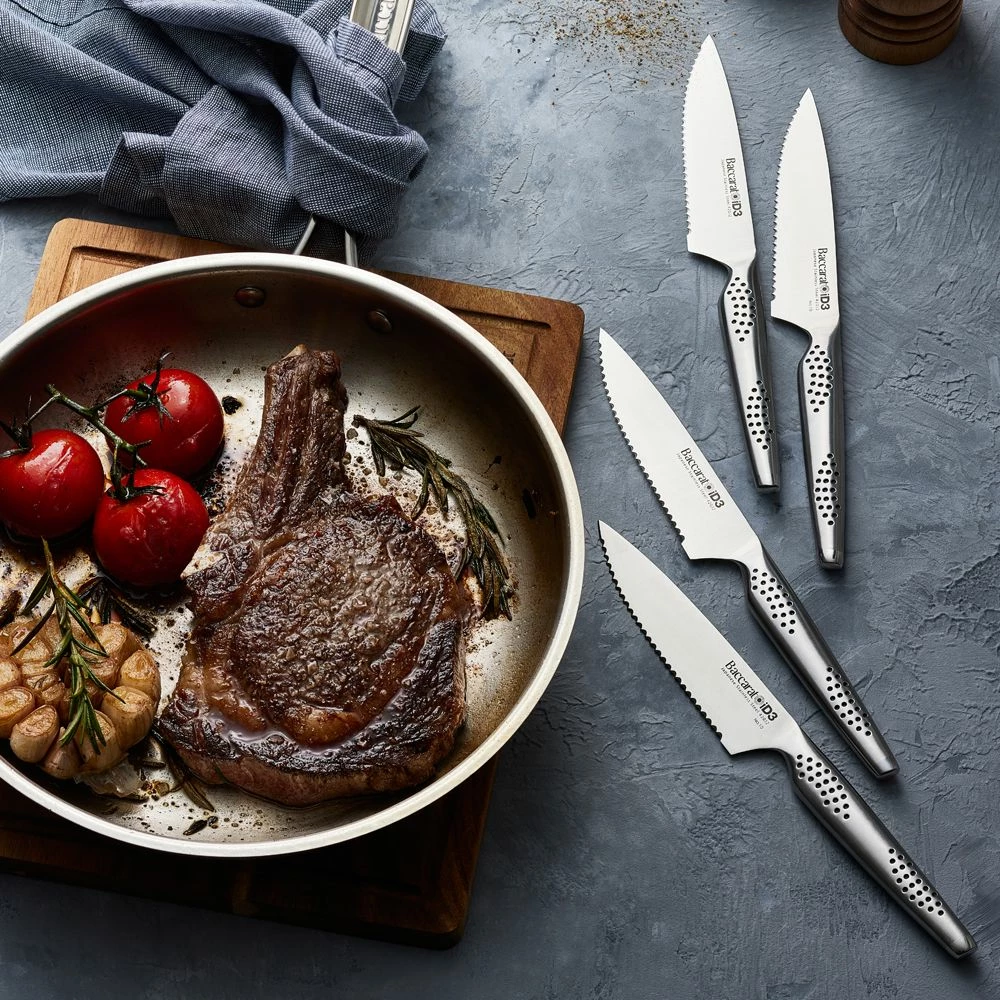 The Performance of the Baccarat® iD3® 4 Piece Steak Knife Set makes it a #1 essential. The Best meals deserve the best equipment. These knives feature razor sharp serrated edges for cutting through meat without crushing or tearing. Enjoy delicious roast dinners, steak nights and other meat dishes.