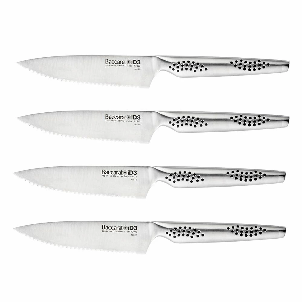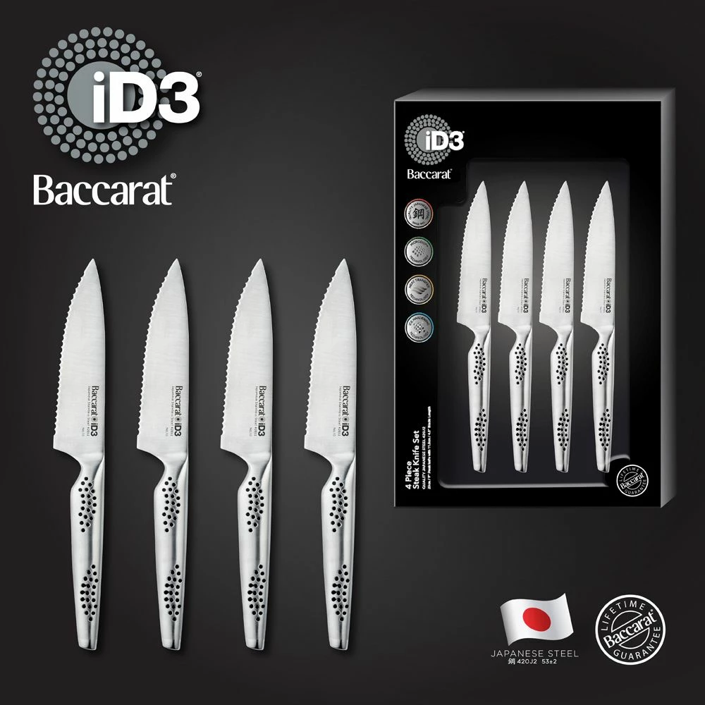 - The Baccarat® iD3® 4-piece knife set includes sleek steak knives with perfectly balanced 11.5cm serrated blades crafted from quality Japanese steel