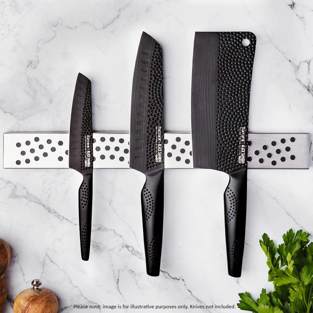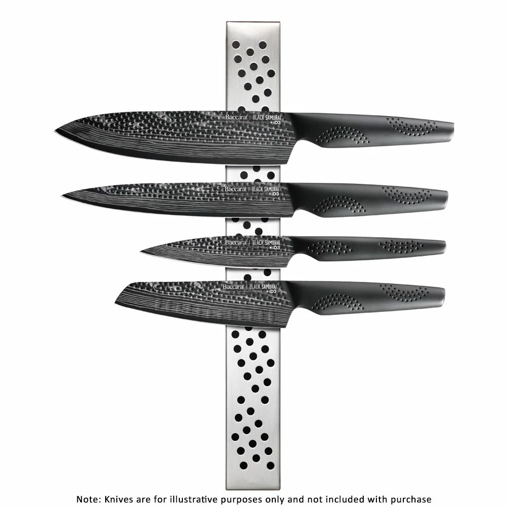 Keeping loose knives from going blunt or getting damaged isn’t easy when you have nowhere to store them. To help keep your kitchen knives in their best possible shape, and prevent accidents and injuries, the Baccarat iD3 Black Samurai Magnetic Knife Holder is the perfect solution. Made with premium quality stainless steel and fitted with super strong industrial grade magnets, the Baccarat iD3 Black Samurai Magnetic Knife Holder is ideal for professional kitchens in cafes and restaurants or small apartment homes with minimal bench space as it can be mounted to any wall, instantly freeing up drawer and counter space. Suitable for use with knives of any brand, shape, and style, the Baccarat iD3 Black Samurai Magnetic Knife Holder not only keeps your knife blades from getting chipped and blunted but also puts them proudly on display and in close reach. Easy to install on tile, plaster, or other flat surfaces, the Baccarat iD3 Black Samurai Magnetic Knife Holder is a stylish solution to tidying up your mix-and-match blades.