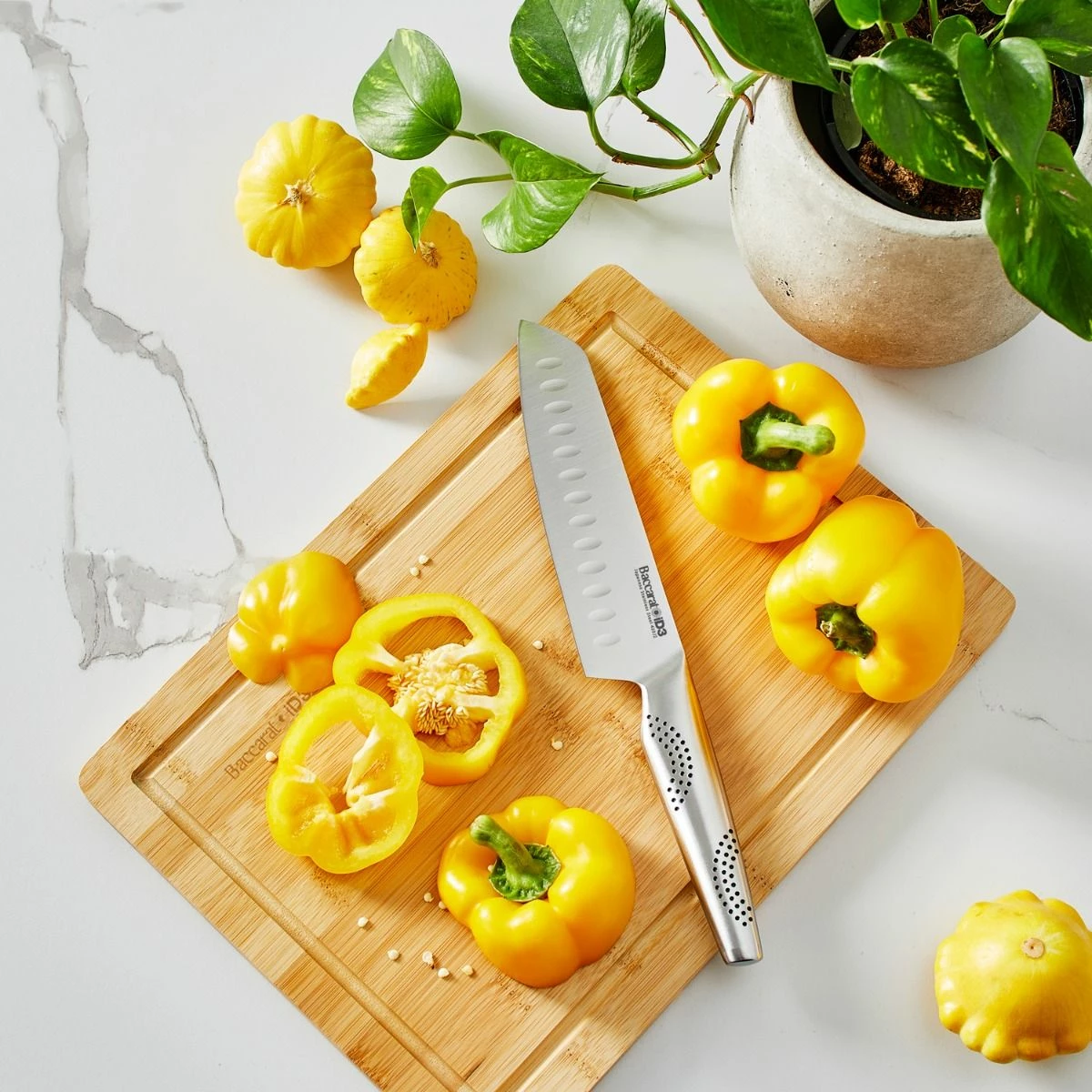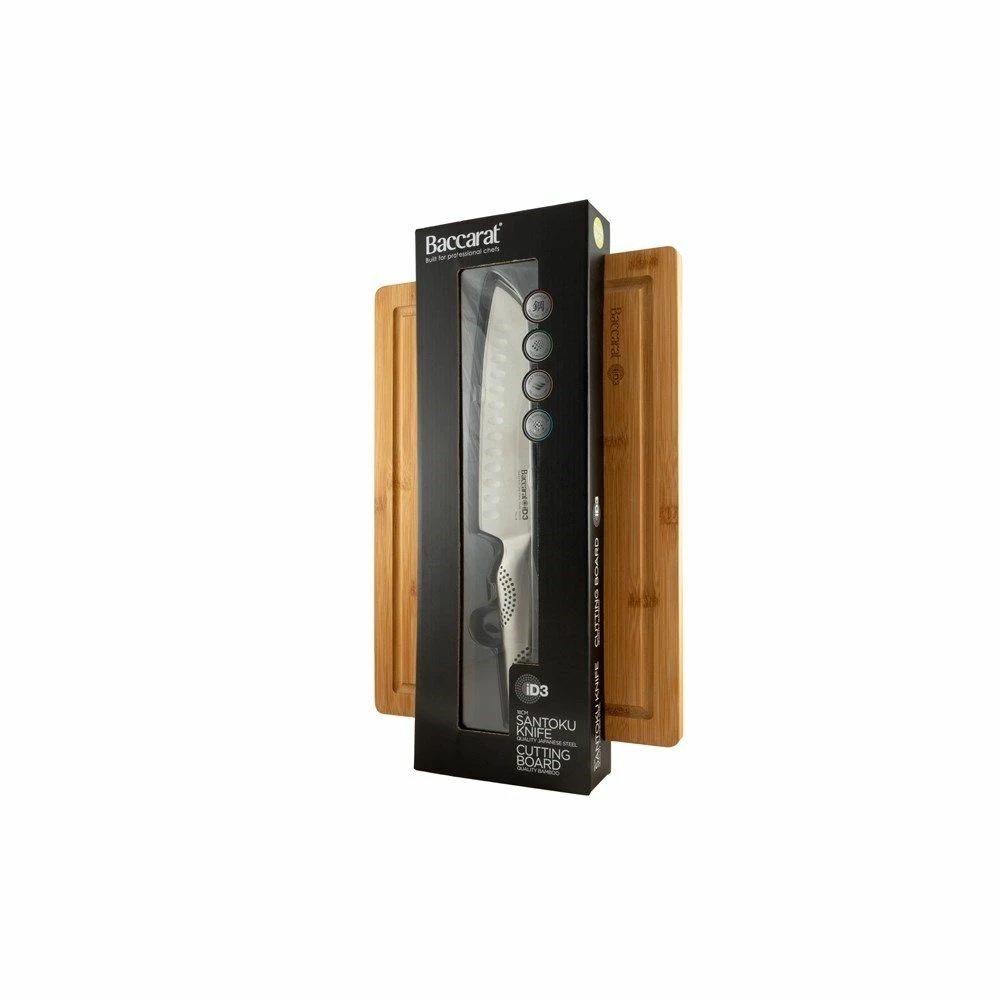 Slice and dice with comfort and style with Baccarat iD3 Santoku & Board! This unique and high-quality piece by Baccarat is bound to make everyday cooking simultaneously easier and exciting. It is made from authentic forged Japanese steel with the highest quality built for chefs. The sophisticated and contemporary design of the Baccarat iD3 Santoku knife is made perfect for daily use at home or business. The blade thickness of Baccarat iD3 Santoku is greatly reduced allowing for a finer, sharper cutting edge . Featuring a premium quality bamboo board, the Baccarat iD3 Santoku & Board are the perfect cooking companion that is both durable and guaranteed to last a lifetime.