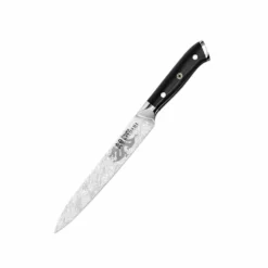 Cut through delicious roast dinners with ease and precision using the premium Baccarat Kiyoshi Japanese Carving Knife! Made from the finest quality Japanese steel, the Kiyoshi knives are inspired by traditional Japanese craftsman and Samurai sword makers. This knife is characterized by distinctive Damascus inspired patterns on the blade of banding and mottling, reminiscent of slowing water. The Kiyoshi knives by Baccarat are made from specialist ice hardened Japanese steel, which makes them super tough, resistant to shattering and capable of being honed to a sharp, resilient edge. Great for carving thick slices of meat, fruit and vegetables, this knife is narrower than a chefs knife, with a curved blade profile to help follow contours and guide meat away from the bone. Engineered and tested to meet Rockwell 53 specification, the Kiyoshi Japanese Carving Knife by Baccarat provides optimum performance. Experience a lifetime of superior quality kitchen cutting experiences with the Kiyoshi Japanese Carving Knife by Baccarat!