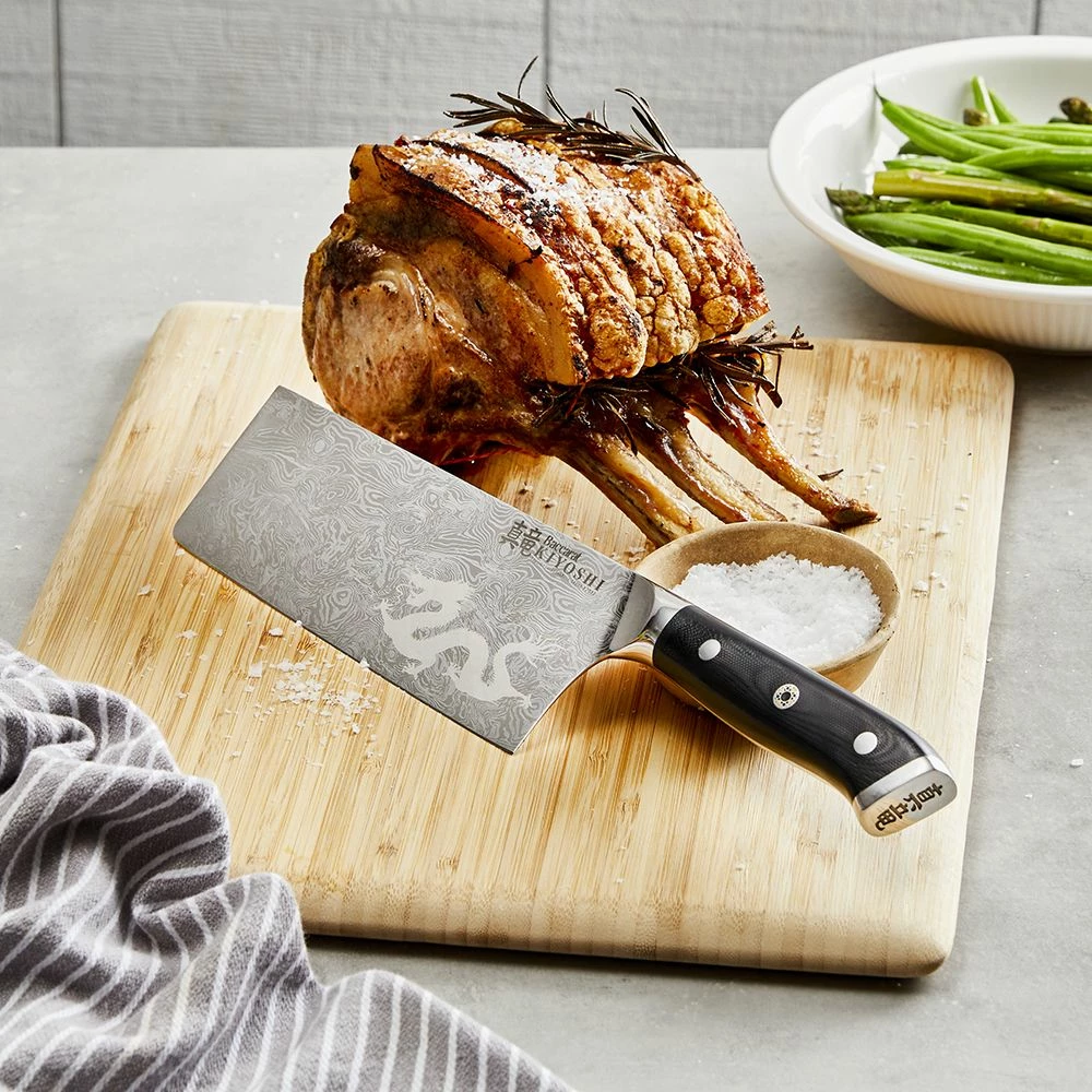 Chop through tough vegetables, meats and bone with the ultra-sharp and precision perfect, Baccarat Kiyoshi Cleaver Knife! Made from the finest quality Japanese steel, the Kiyoshi knives are inspired by traditional Japanese craftsman and Samurai sword makers. This knife is characterized by distinctive Damascus inspired patterns on the blade of banding and mottling, reminiscent of slowing water. The Kiyoshi knives by Baccarat are made from specialist ice hardened Japanese steel, which makes them super tough, resistant to shattering and capable of being honed to a sharp, resilient edge. Designed for portioning poultry, larger cuts and small cuts of meat, it has been engineered to be weighted making chopping through bone and joint cutting faster. Engineered and tested to meet Rockwell 53 specification, the Kiyoshi Japanese Cleaver Knife by Baccarat provides optimum performance. Experience a lifetime of superior quality kitchen cutting experiences with the Kiyoshi Japanese Cleaver Knife by Baccarat!