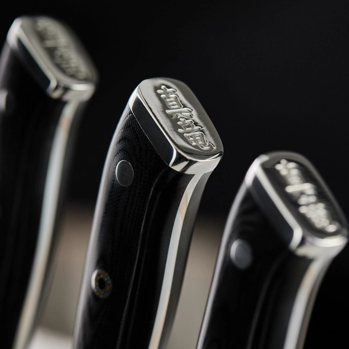 - Triple-riveted handle with an exquisite mosaic motif paying homage to a traditional Japanese Samurai sword