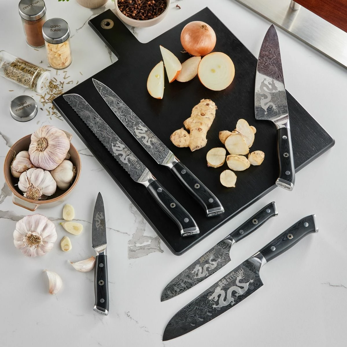 Chefs Knife: 20cm, Bread Knife: 20cm, Carving Knife: 20cm, Santoku Knife: 17cm, Santoku Knife: 12.5cm, Paring Knife: 9cm