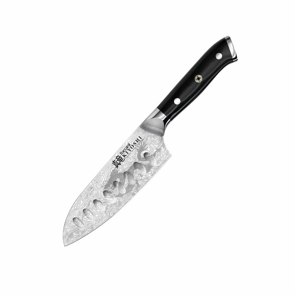 Slice, dice and mince ingredients like a professional chef using the premium Baccarat Kiyoshi Santoku Knife! Made from the finest quality Japanese steel, the Kiyoshi knives are inspired by traditional Japanese craftsman and Samurai sword makers. This knife is characterized by distinctive Damascus inspired patterns on the blade of banding and mottling, reminiscent of slowing water. The Kiyoshi knives by Baccarat are made from specialist ice hardened Japanese steel, which makes them super tough, resistant to shattering and capable of being honed to a sharp, resilient edge. The santoku has a low tip and a broad blade that’s perfect for slicing, dicing and mincing. The recesses situated above the blade edge helps to release thin slices and sticky food after slicing. Engineered and tested to meet Rockwell 53 specification, the Kiyoshi Japanese Santoku Knife by Baccarat provides optimum performance. Experience a lifetime of superior quality kitchen cutting experiences with the Kiyoshi Japanese Santoku Knife by Baccarat!