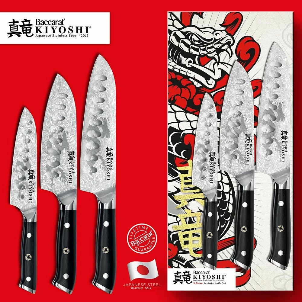- Featuring a distinctive trademark dragon on the blades and inspired by traditional Damascus, the KIYOSHI® knives by Baccarat® feature triple-riveted handles with an exquisite mosaic motif