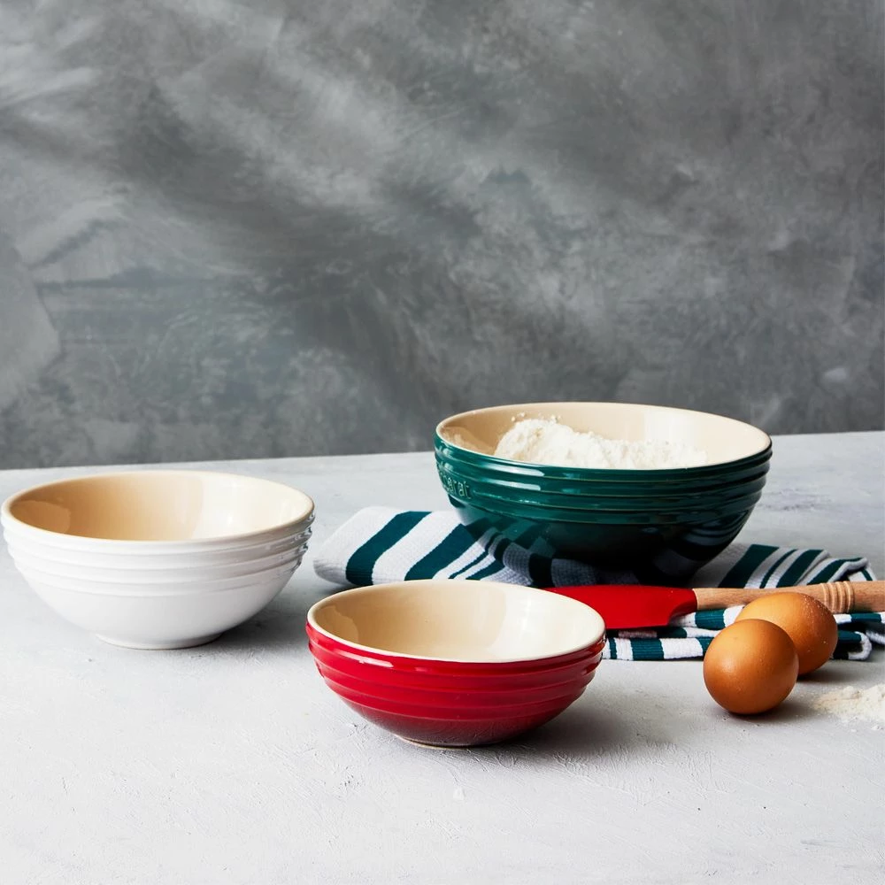 Serve in style with the Baccarat Le Connoisseur 3 Piece Stoneware Serving Bowl Set. A lovely way to plate salads, sides and other shared dishes, this serving bowl set offers you many ways to present your food. Featuring 3 different sized options, including a large Teal, medium White and small Red bowl, you can mix and match servings for the ideal dining experience. Made from finely crafted stoneware, these bowls are well suited to indoor and outdoor dining, protected against the bumps and knocks of everyday use. Their vivid tricolor design is French inspired, lending a classic and timeless touch to any table setting. Each bowl is oven safe and dishwasher friendly for easy cleaning.