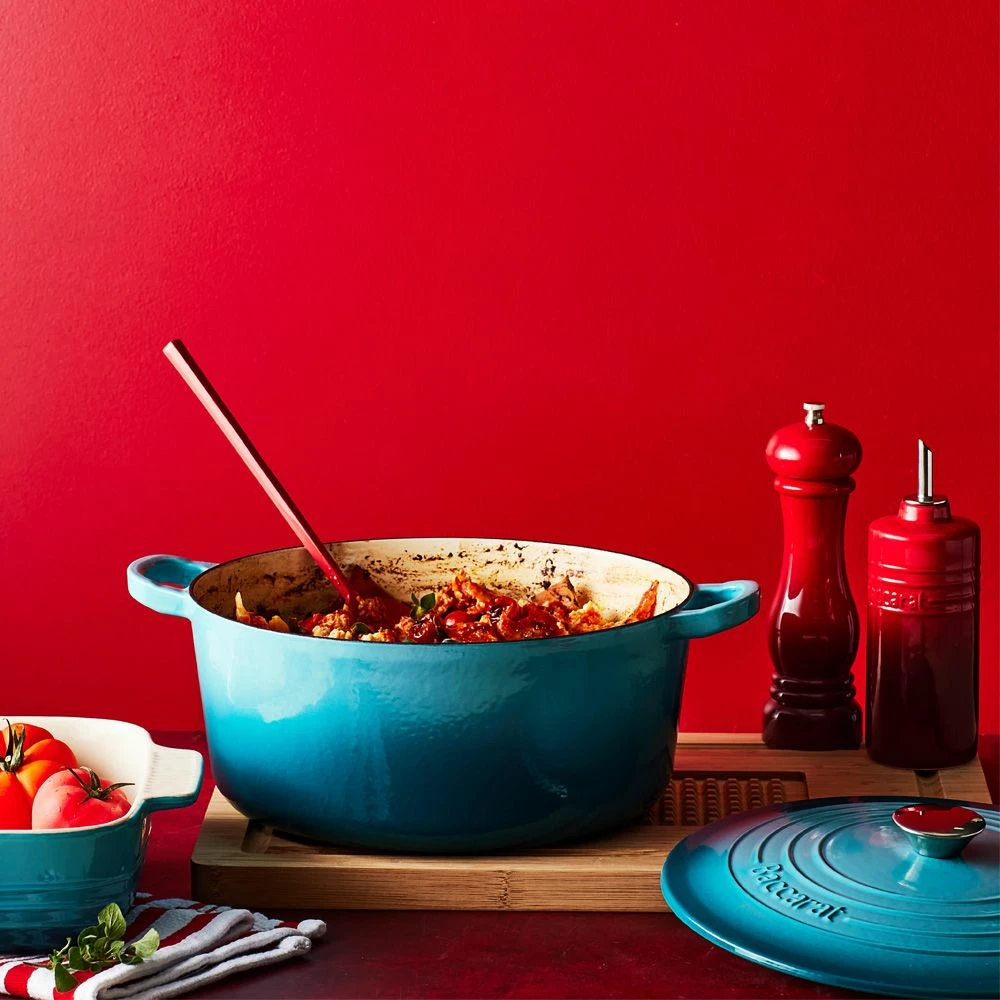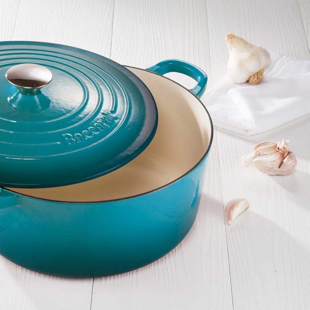 A cast iron frame is used for Le Connoisseur cookware, due to it being one of the best materials for retaining, conducting and distributing heat evenly. The heavy thickness of the body and lid is designed to encase heat around the food for exceptional cooking results. Self basting spikes have been applied on the surface of the lid to collect and direct moisture back into the dish, creating a juicy and succulent meal. Transport your food from cooktop to table, with generously sized handles that ensure your French Oven is easy to hold and carry. Enjoy familiar, rustic styling with an easy clean double layer enamel surface, that requires absolutely zero seasoning out of the box. The Baccarat Le Connoisseur Round French Oven 6.3L is oven and dishwasher safe, and suitable for all cooktops including induction.