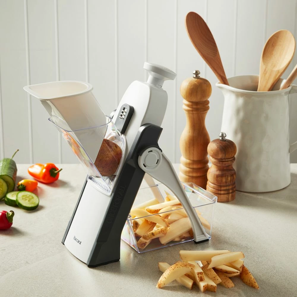 Chop your favourite fresh ingredients with enhanced precision and ease using the innovative Baccarat Prepare Stand Up Mandoline! Ideal for preparing all kinds of vegetables for salads, soups and stirfrys, the Prepare Stand Up Mandoline is a must-have for any avid home cook. Slice, dice and julienne anything from sweet potato to zucchini and achieve your desired thickness between 0.5mm to 8mm with the multi-blade settings. Exceptionally easy to use, the Prepare Stand Up Mandoline offers simple action slicing to help you cut down on food preparation time. Equipped with suction feet, this slicer is designed to stay firmly in place while in use for optimum safety and stability. It has a folding stand for space-saving storage and comes equipped with a clear container that sits in position to receive the cut ingredients minus any mess! Enjoy the ultimate meal preparation experience with the Baccarat Prepare Stand Up Mandoline.