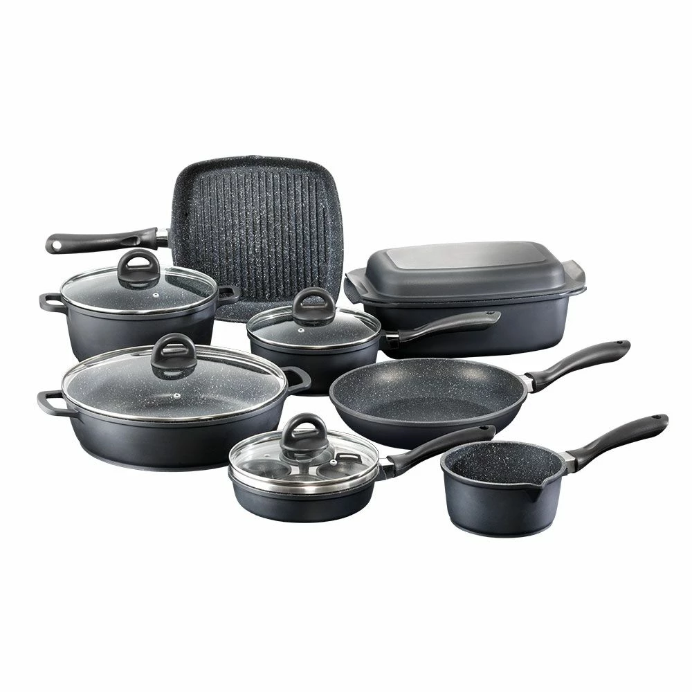 1 x Milk Pan, 1 x Frypan, 1 x 4 Cup Egg Poacher with Glass Lid, 1 x Saucepan with Glass Lid, 1 x Frypan, 1 x Saute Pan with Glass Lid, 1 x Casserole with Glass Lid, 1 x Grill Pan, 1 x Roaster & Lid