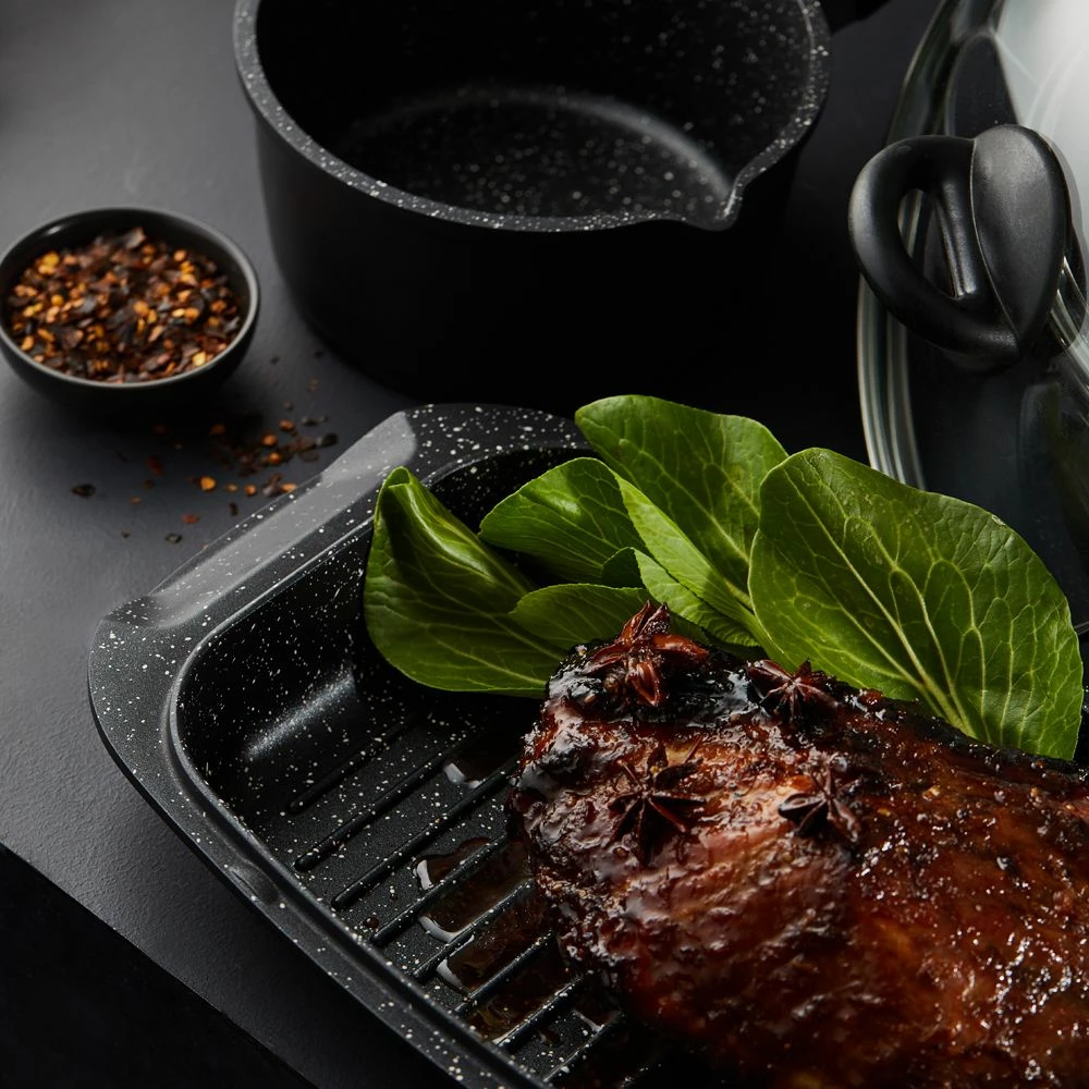 Enhance your everyday cooking experiences with the premium Baccarat Stone 10 Piece Cookware Set. Offering all the essentials for your favourite culinary ventures, this set is a versatile addition to your culinary collection that’s guaranteed to inspire some creativity and experimentation in the kitchen. ‘Stone’ non stick coating is environmentally friendly, PFOA pollution free and provides easy lasting food release for your convenience. The body of this superior cookware provides effective and even heat distribution, reducing cooking times and saving energy. Fantastic for searing, roasting, boiling and more, this versatile set features a 16cm milk pan, 20cm frypan, 20cm saucepan with glass lid, 28cm frypan, 32cm saute pan with glass lid, 24cm casserole with glass lid, 28cm grill pan, 32cm roaster with lid as well as a 4 cup egg poacher with glass lid. Equipped with quality tempered glass easy view lids, the Stone Cookware Set by Baccarat allows you to easily monitor your food while it cooks, to avoid overcooking and achieve delicious results every time! The ultra-tough cast aluminium body offers long lasting durability and outstanding culinary experiences. Suitable for use on all cooktops, the Baccarat Stone 10 Piece Cookware Set is a versatile staple for every kitchen. Easy to clean, this set is dishwasher friendly and comes backed by the Baccarat Lifetime Guarantee!