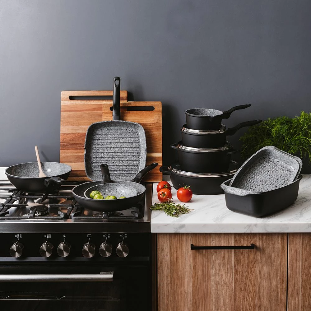 - Comprehensive set comes equipped with Milkpan: 16cm, Saucepan with Lid: 20cm, Casserole with Lid: 24cm, Grill Pan: 28cm, Frying Pan: 28cm, Frying Pan: 20cm, Saute Pan with Lid: 32cm, Wok: 28cm, Roaster: 32cm, Roaster Lid/Dish: 32cm