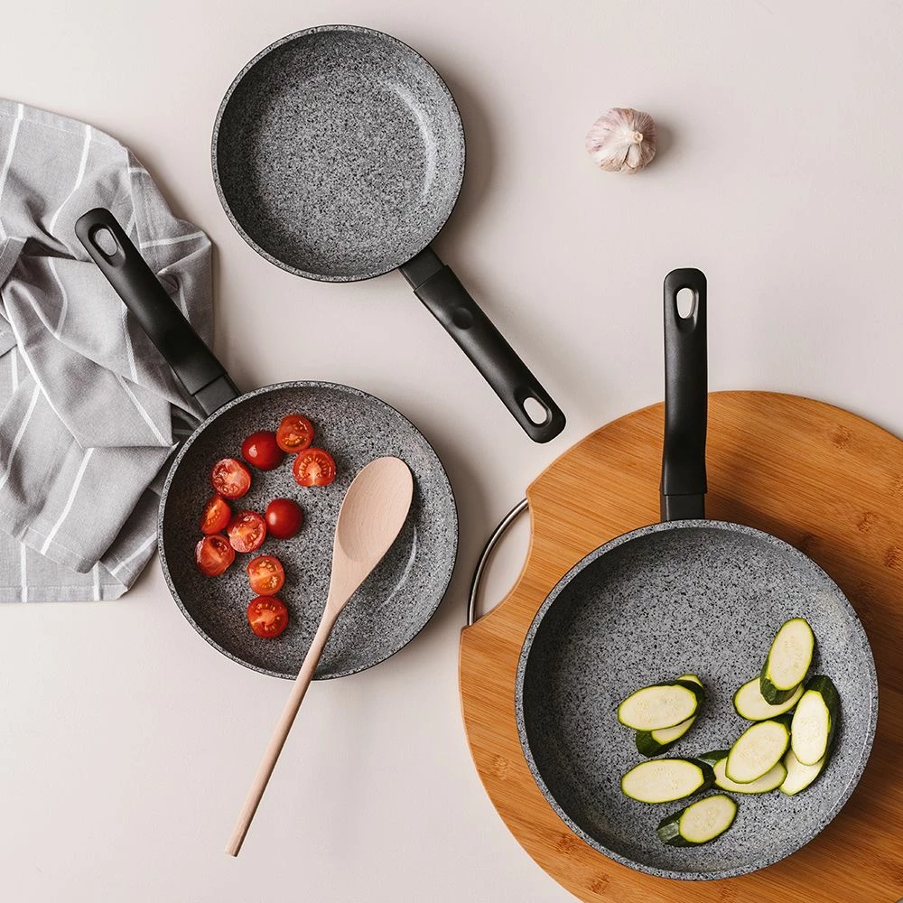 The Baccarat Stone X2 Frypan Tri Pack is a value packed essential cookware set for every home chef. The Stone X2 Non Stick Frypan Tri Pack is the newer, improved piece from the classic Baccarat Stone range, suitable for all cooktops and is oven and dishwasher safe for total convenience. The Baccarat Stone X2 Frypans feature a non-stick ceramic interior that is environmentally friendly, PFOA pollution free, hard wearing and easy to clean. Being non-stick, little to no oils or fats are needed, allowing you to cook leaner, healthier meals. The Baccarat Stone X2 Frypan’s body helps to provide effective and even heat distribution, reducing your cooking times and saving critical energy and fuel. Fitted with a rivet-free soft handle, the Baccarat Stone X2 Non Stick Frypans are easy and comfortable to grip, promoting safe cooking. Ideal for searing steaks and fish, cooking eggs, veggies, and much, much more, the Baccarat Stone X2 Non Stick Frypan Tri Pack is a must-have for creating all your favourite dishes.