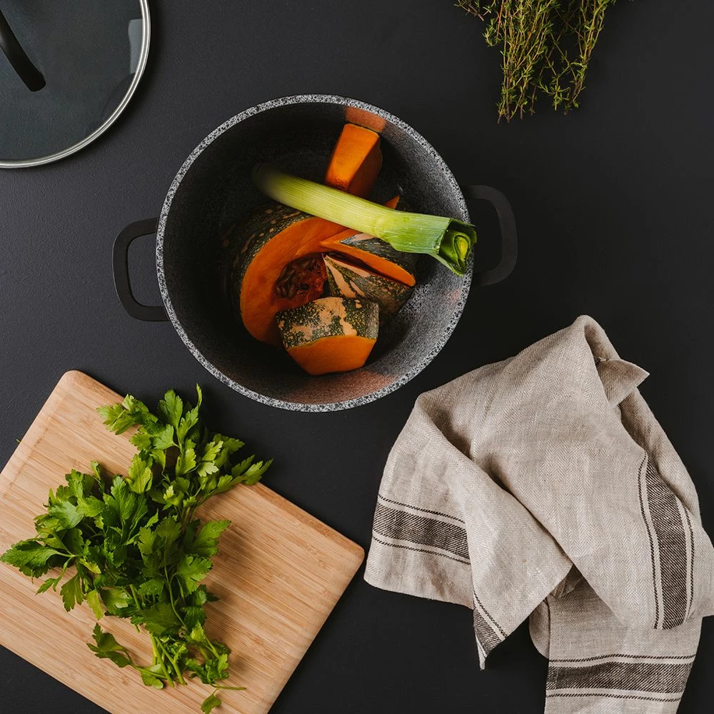 The Baccarat Stone X2 Stockpot is a value packed essential cookware item for every home chef. The Stone X2 Non Stick Stockpot is the newer, improved piece from the classic Baccarat Stone range, suitable for all cooktops and is oven and dishwasher safe for total convenience. The Baccarat Stone X2 Stockpot features a non-stick ceramic interior that is environmentally friendly, PFOA pollution free, hard wearing and easy to clean. Being non-stick, little to no oils or fats are needed, allowing you to cook leaner, healthier meals. The Baccarat Stone X2 Stockpot provides effective and even heat distribution, reducing your cooking times and saving critical energy and fuel. Fitted with rivet-free handles with bonus silicone pot holders, the Baccarat Stone X2 Non Stick Stockpot is easy and comfortable to grip, promoting safe cooking. Ideal for boiling pasta, making soups, stews, and much, much more, the Baccarat Stone X2 Non Stick Stockpot is a must-have for creating all your favourite dishes.