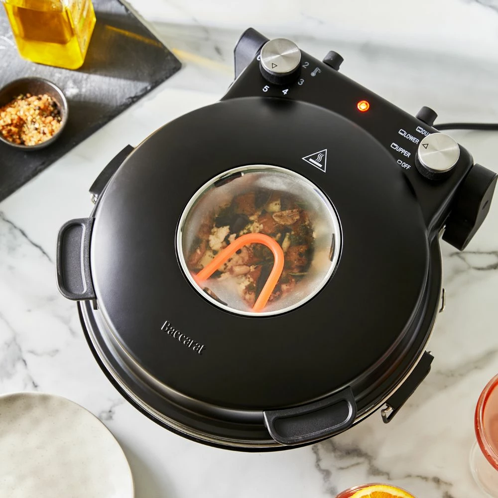 Restaurant quality pizza is easy to achieve at home when you have The Gourmet Slice Pizza Oven by Baccarat®! This pizza maker is a must-have appliance for every pizza lover to achieve the best results at home. The Gourmet Slice Pizza Oven is constructed from premium steel and features a modern black finish. Inside is a removable ceramic baking stone that not only distributes heat evenly but helps you to achieve that perfect crispy pizza base. The Gourmet Slice Pizza Oven by Baccarat® features dual heating elements that are controlled easily by the dial system – set your Pizza Oven to heat the top and bottom elements at the same time or independently to achieve your ideal results, while the heat dial system allows you to set your Pizza Oven up to 400 degrees for most pizzas or lower for warming or reheating food. The Gourmet Slice Pizza Oven by Baccarat® is also fitted with handy lifting brackets that prop up the lid of the pizza oven to accommodate for pizzas with extra high toppings or yummy baked goods. The viewing window on the lid of your Baccarat® The Gourmet Slice Pizza Oven makes monitoring your pizza easy, allowing you to keep an eye on the cooking process without losing any heat. Never made pizza at home before? Well Baccarat® has you covered! The Gourmet Slice Pizza Oven includes a recipe booklet to guide you through making a variety of pizzas, including fresh dough bases, pita bread bases plus a whole range of toppings from classic pizza shop varieties to gourmet specialities! So if you or someone you know is a pizza fanatic, look no further than the Baccarat® The Gourmet Slice Pizza Oven.