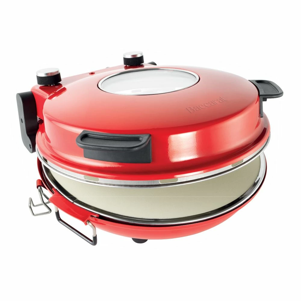 INTRODUCTORY OFFER. Restaurant quality pizza is easy to achieve at home when you have The Gourmet Slice Pizza Oven by Baccarat®! This pizza maker is a must-have appliance for every pizza lover to achieve the best results at home. The Gourmet Slice Pizza Oven is constructed from premium steel and features a stunningly bold red colourway. Inside is a removable ceramic baking stone that not only distributes heat evenly but helps you to achieve that perfect crispy pizza base. The Gourmet Slice Pizza Oven by Baccarat® features dual heating elements that are controlled easily by the dial system – set your Pizza Oven to heat the top and bottom elements at the same time or independently to achieve your ideal results, while the heat dial system allows you to set your Pizza Oven up to 400 degrees for most pizzas or lower for warming or reheating food. The Gourmet Slice Pizza Oven by Baccarat® is also fitted with handy lifting brackets that prop up the lid of the pizza oven to accommodate for pizzas with extra high toppings or yummy baked goods. The viewing window on the lid of your Baccarat® The Gourmet Slice Pizza Oven makes monitoring your pizza easy, allowing you to keep an eye on the cooking process without losing any heat. Never made pizza at home before? Well Baccarat® has you covered! The Gourmet Slice Pizza Oven includes a recipe booklet to guide you through making a variety of pizzas, including fresh dough bases, pita bread bases plus a whole range of toppings from classic pizza shop varieties to gourmet specialities! So if you or someone you know is a pizza fanatic, look no further than the Baccarat® The Gourmet Slice Pizza Oven.