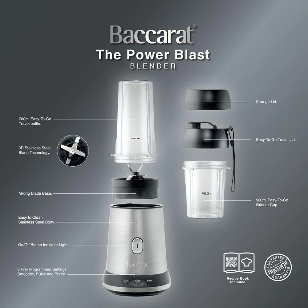 With the Baccarat Power Blast Blender, you can make delicious, healthy smoothies! Innovatively designed, this blender features 3D stainless steel technology, which blends your fresh ingredients down and transforms them into a delicious, smooth drink with a super fine texture. This blender comes equipped with a 700ml Travel Bottle and an Easy-To-Go Travel Lid, which are fantastic for taking with you to work or school. Simply remove the tumbler, twist on the top, and you’re ready to go! A 500ml Grinder Cup and a storage cover are also included, which is ideal for storing pre-prepared recipes. Not only does The Power Blast Blender create fresh smoothies, but it’s ideal for pureeing soups, preparing sauces and salsas. The Baccarat The Power Blast Blender is an absolute must!
