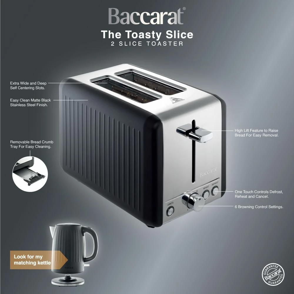 INTRODUCTORY OFFER. Start your day with a scrumptious slice of crispy toast cooked to perfection in The Toasty Slice 2 Slice Toaster by Baccarat®. A kitchen essential with a stylish and contemporary look, this toaster boasts a sleek matte black stainless steel finish. Your toast will be browned to perfection every time with the 6 browning control settings and the one touch defrost and reheat controls. Thanks to the extra wide and deep self-centring slots, The Toasty Slice 2 Slice Toaster by Baccarat® can fit a wide variety of sized breads, crumpets, muffins and waffles with delicious results. You can also toast straight from the freezer thanks to the convenient defrost value. The handy reheat setting warms back to toasty goodness. The high lift feature to raise bread for easy removal and removable bread crumb tray for easy cleaning. Complete the look by matching The Toasty Slice 2 Slice Toaster to The Boiling Point Kettle by Baccarat®.