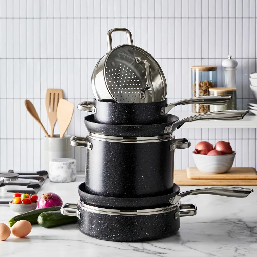 - Tempered glass lids with integrated steam vents allow for safe viewing of your food as it cooks and ensures dishes stay fresh while being served
