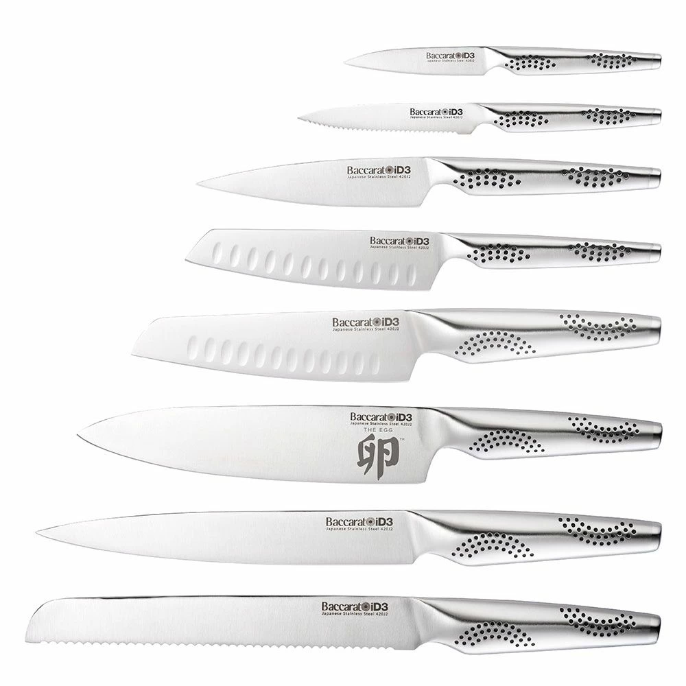 - The Baccarat® iD3® THE EGG 9-Piece Knife Block contains: 1 x 9cm Paring Knife, 1 x 10cm Serrated Utility Knife, 1 x 11cm Straight Edge Utility Knife, 1 x 12.5cm Santoku Knife, 1 x 15cm Santoku Knife, 1 x 20cm Chef Knife, 1 x 20cm Carving Knife, and 1 x 20
